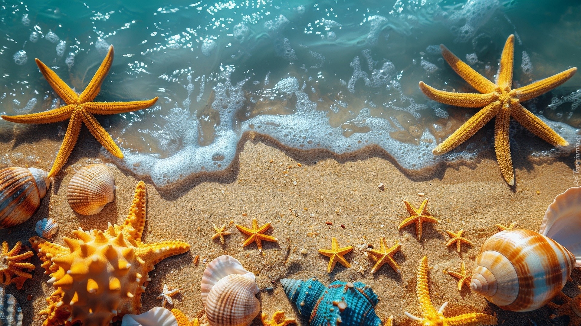 Edytor tapety: Rozgwiazdy i kolorowe muszelki na morskiej plaży