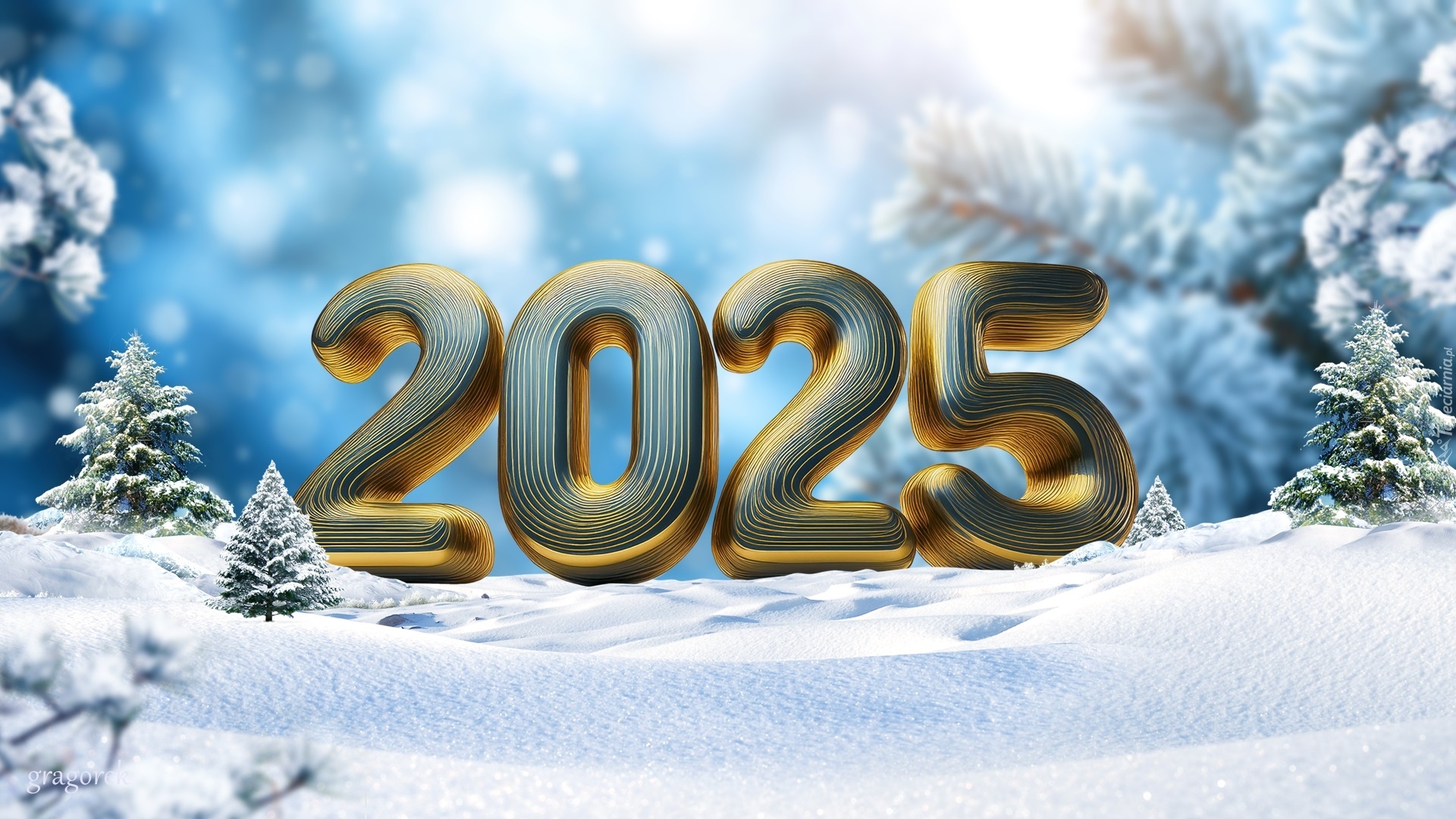 Edytor tapety: Złote cyfry 2025 na śniegu w grafice