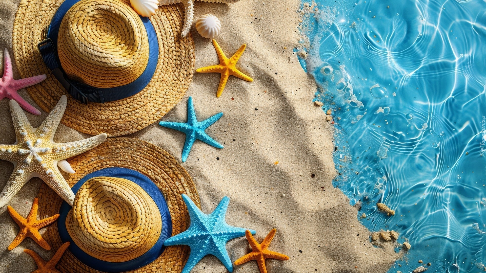 Edytor tapety: Dwa kapelusze i kolorowe rozgwiazdy na morskiej plaży