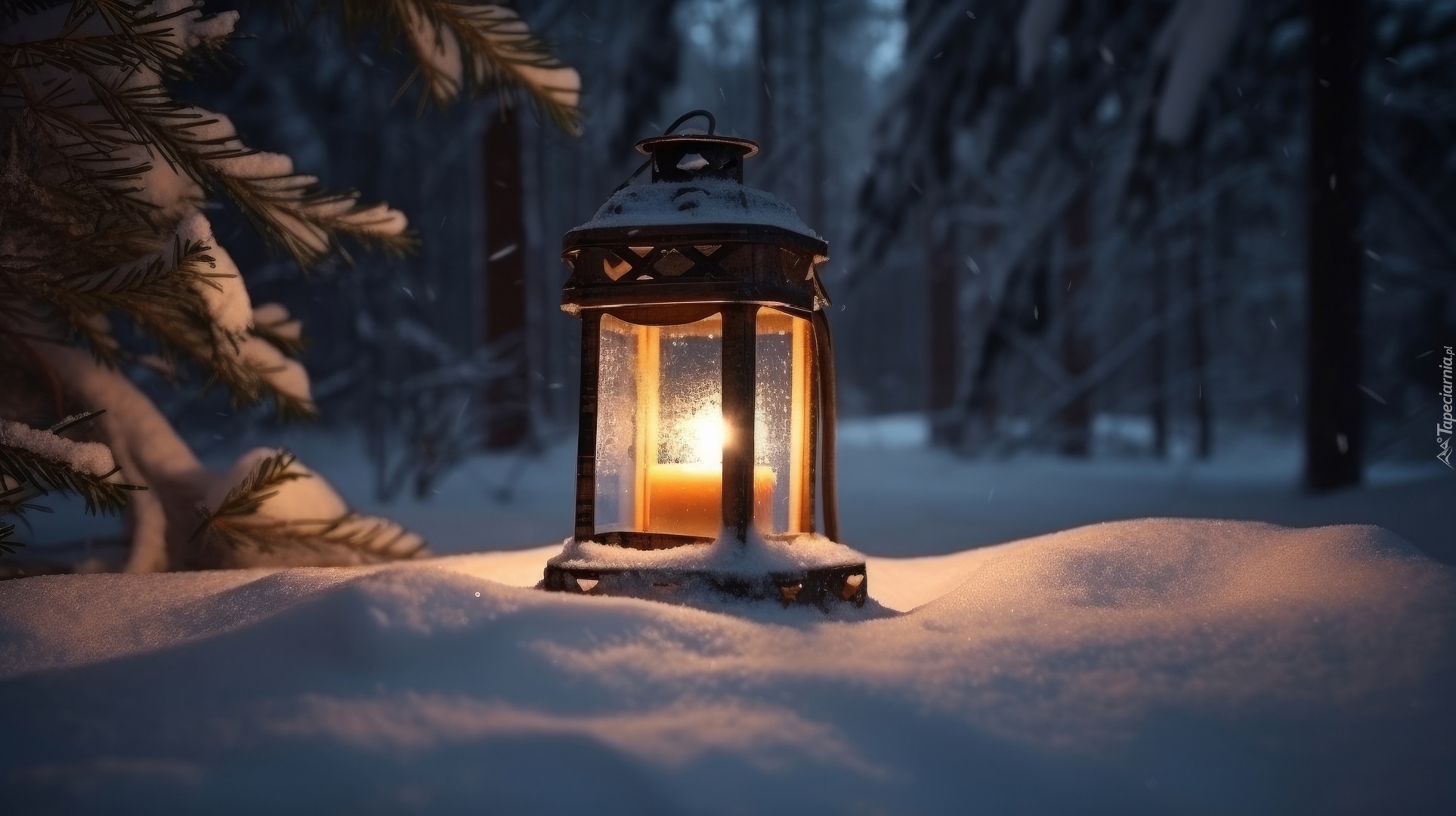 Edytor tapety: Zapalona świeca w lampionie na śniegu