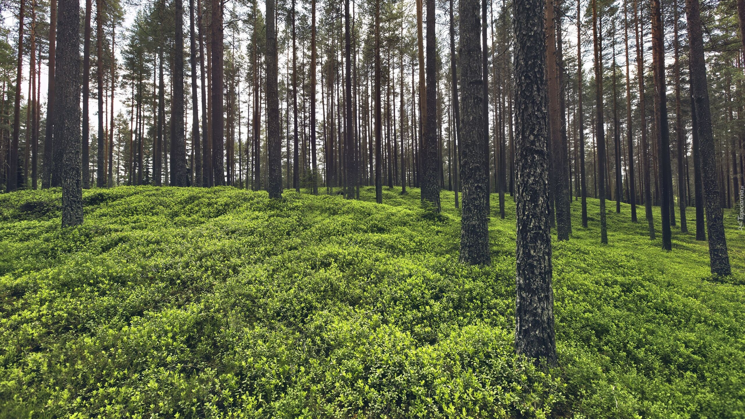 Edytor tapety: Rośliny pod wysokimi drzewami w lesie iglastym