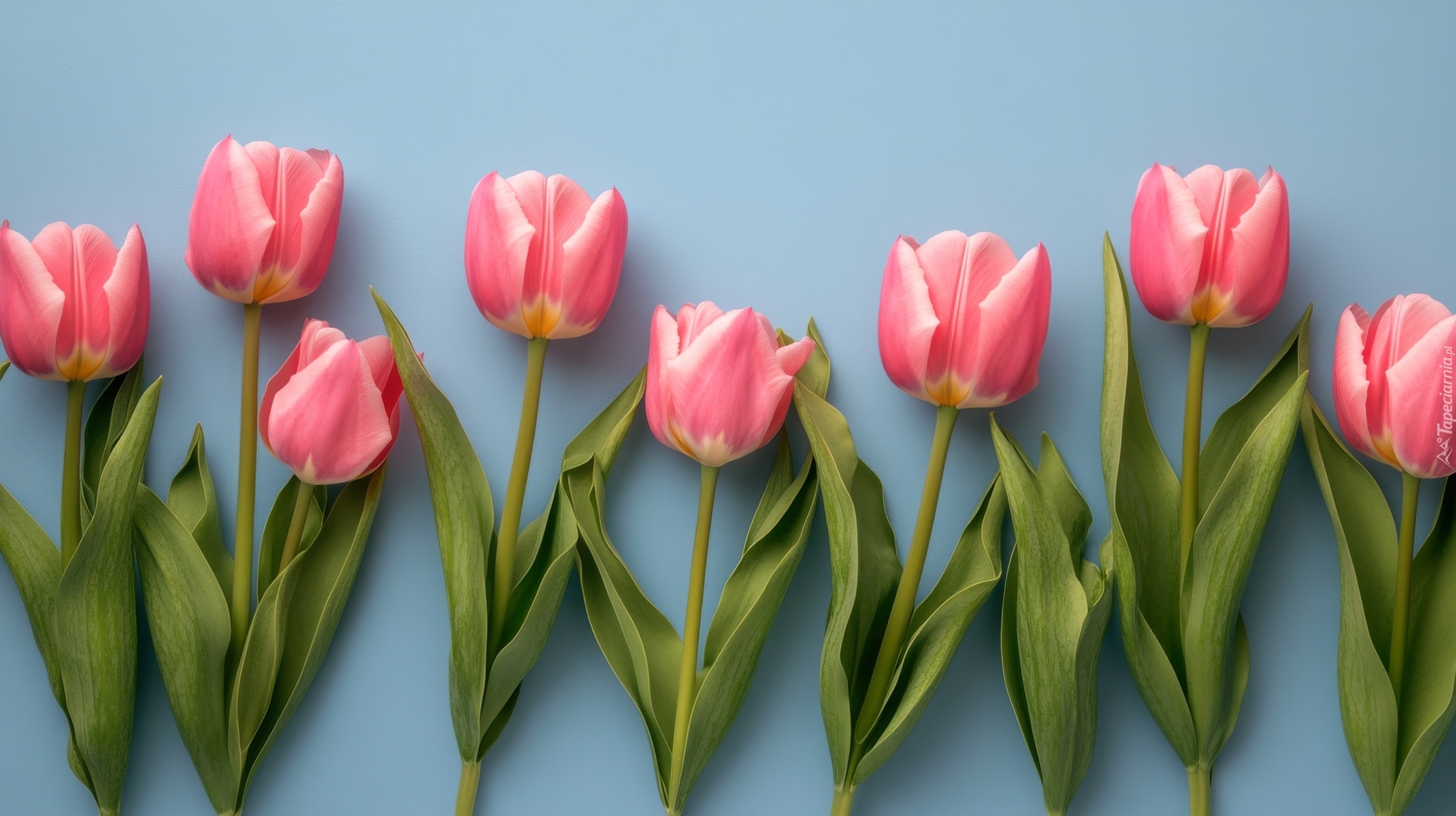 Edytor tapety: Rozkwitnięte różowe tulipany na niebieskim tle