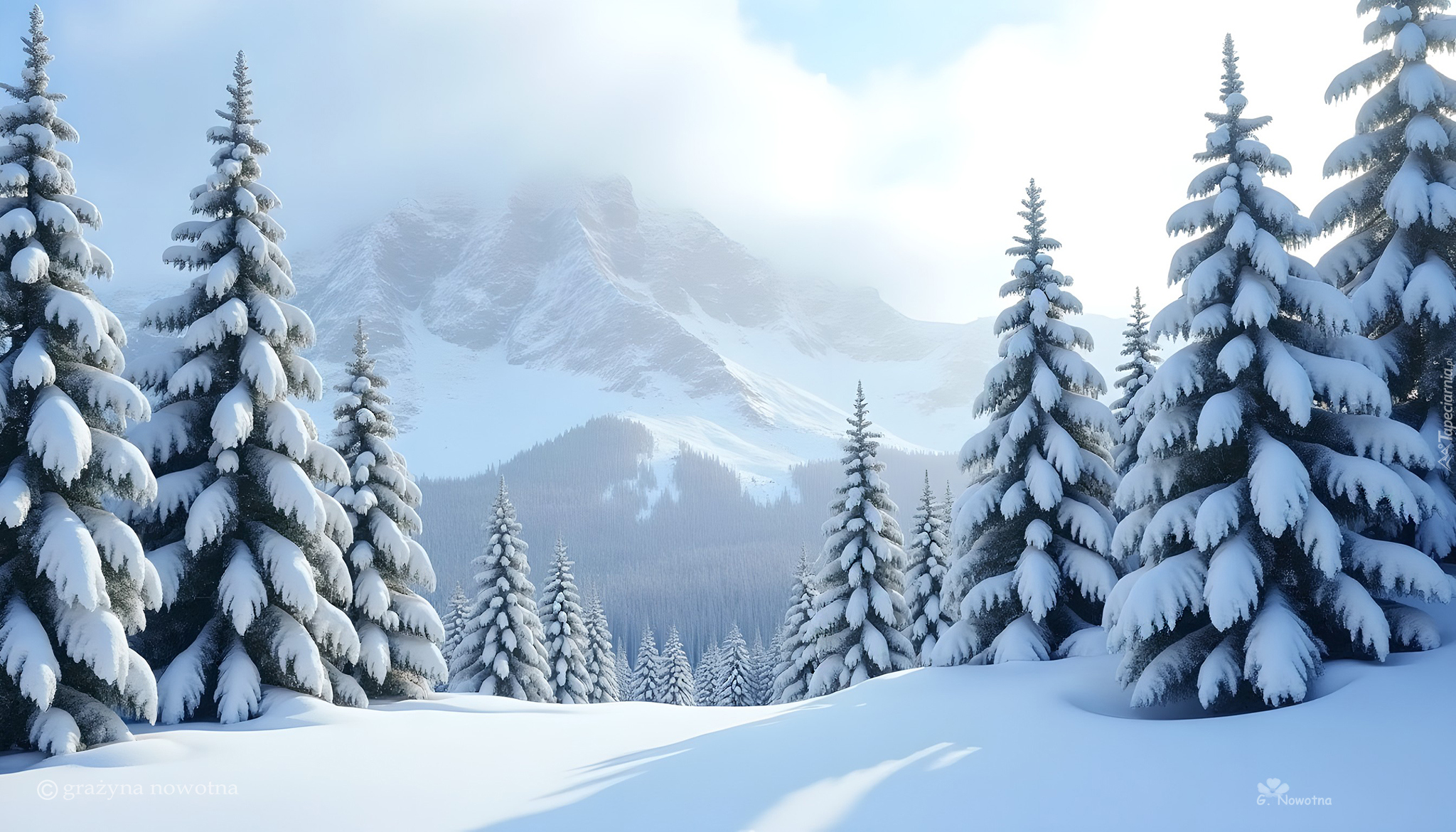Edytor tapety: Ośnieżone świerki na tle ośnieżonych gór w oddali
