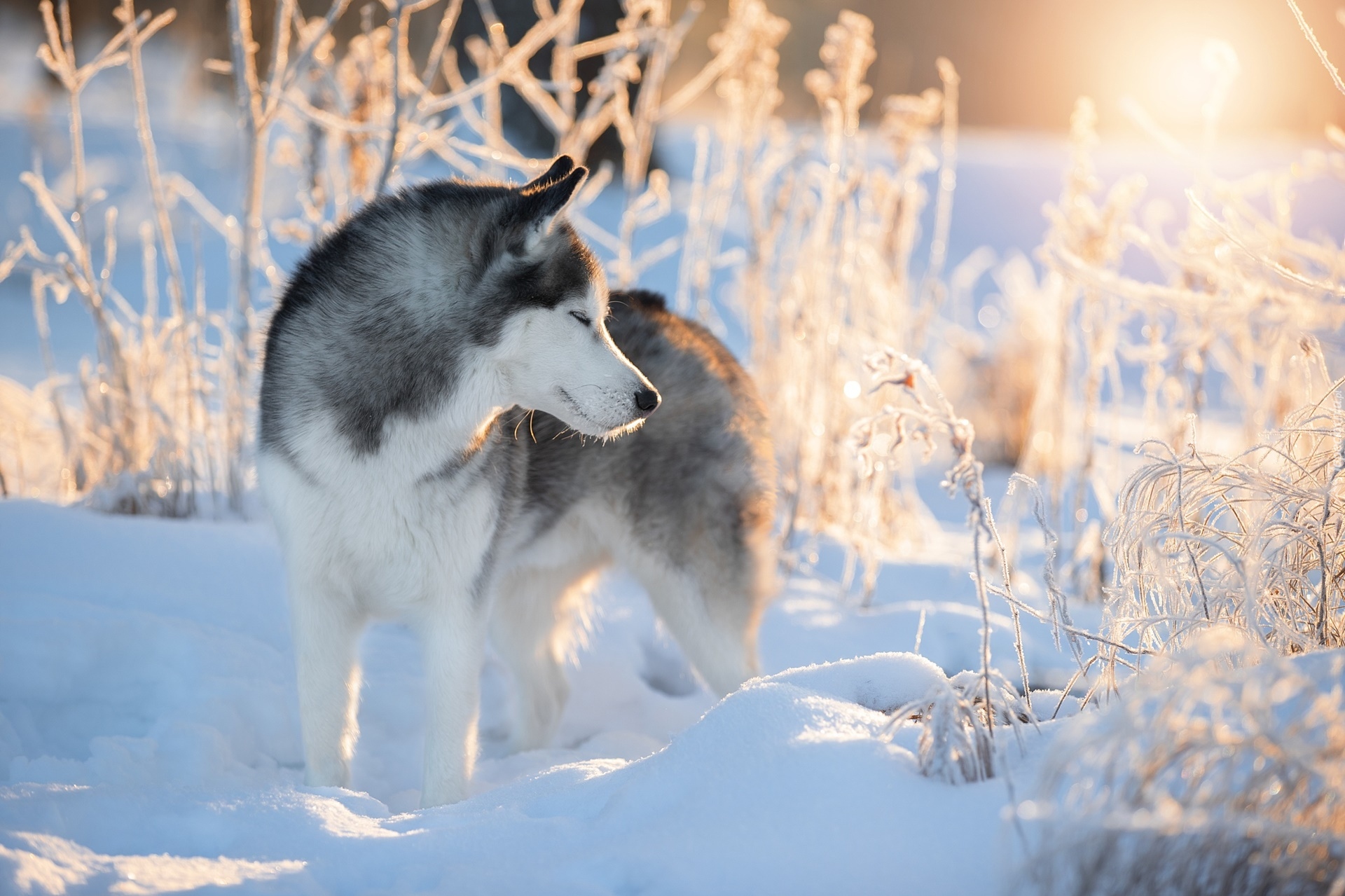 Edytor tapety: Siberian husky i rozświetlone słońcem rośliny w śniegu