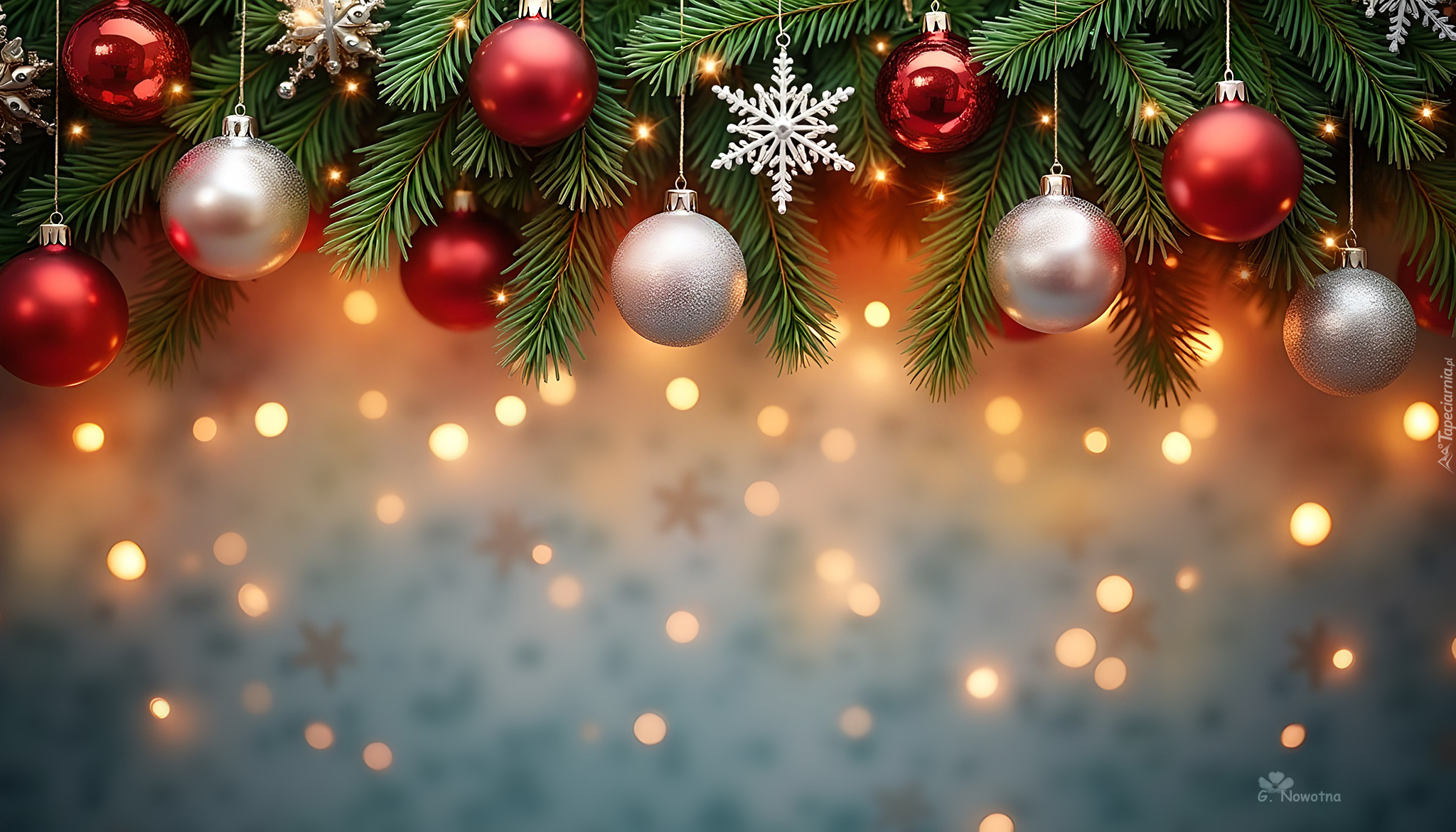 Edytor tapety: Czerwone i srebrne bombki wiszące na świerkowych gałązkach