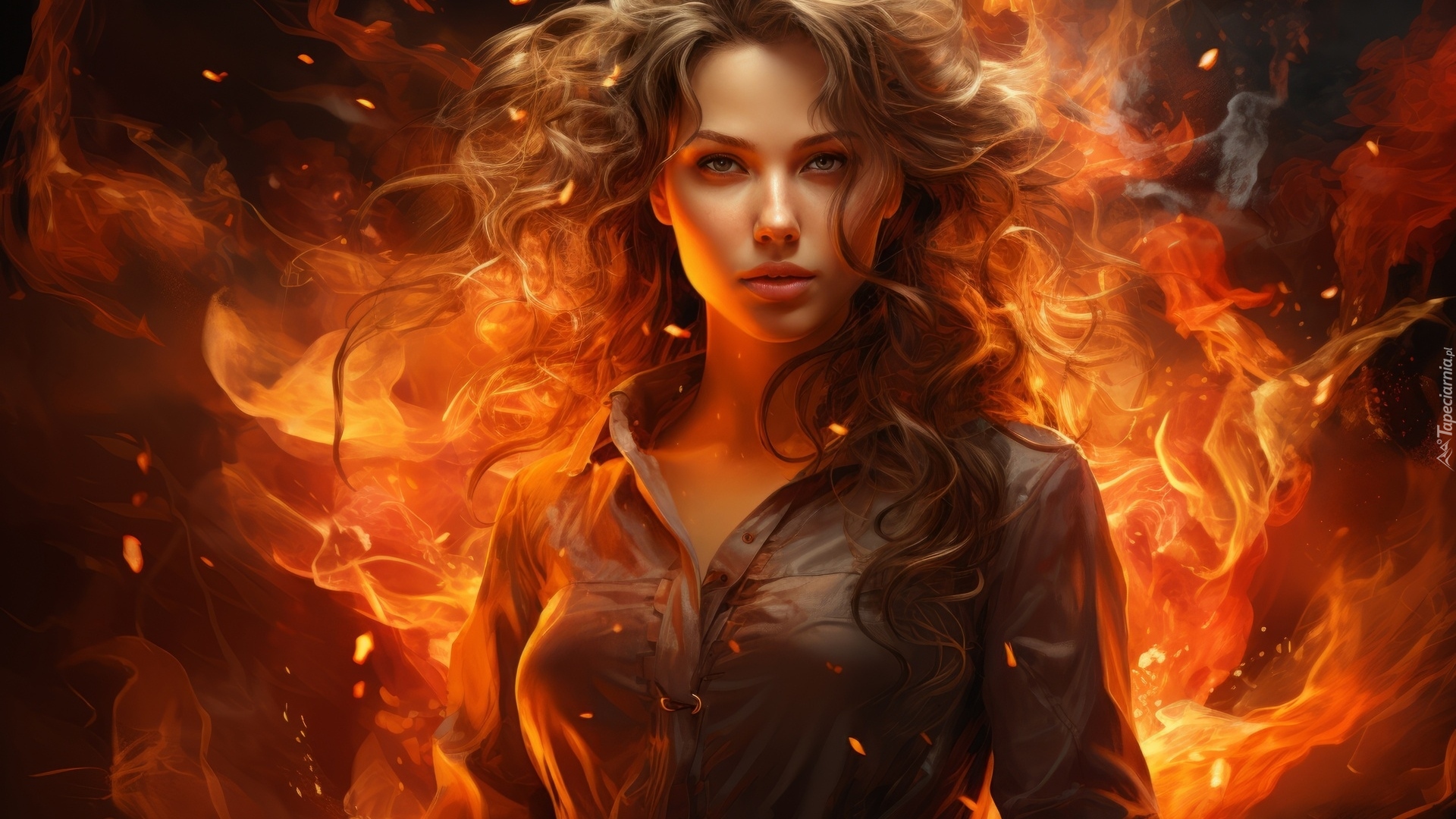Edytor tapety: Długowłosa dziewczyna w koszuli na tle ognia