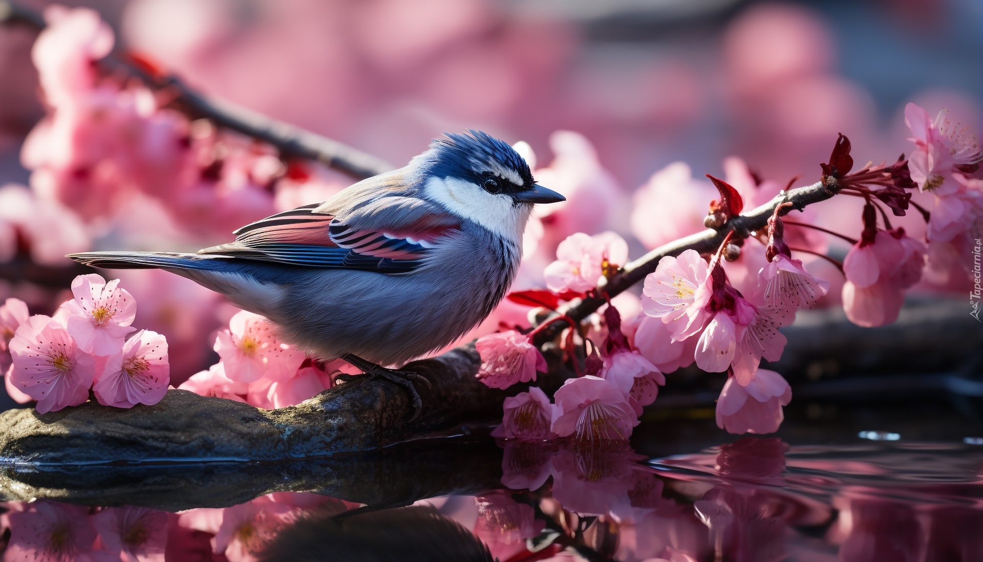 Edytor tapety: Ptak na ukwieconej gałązce nad wodą