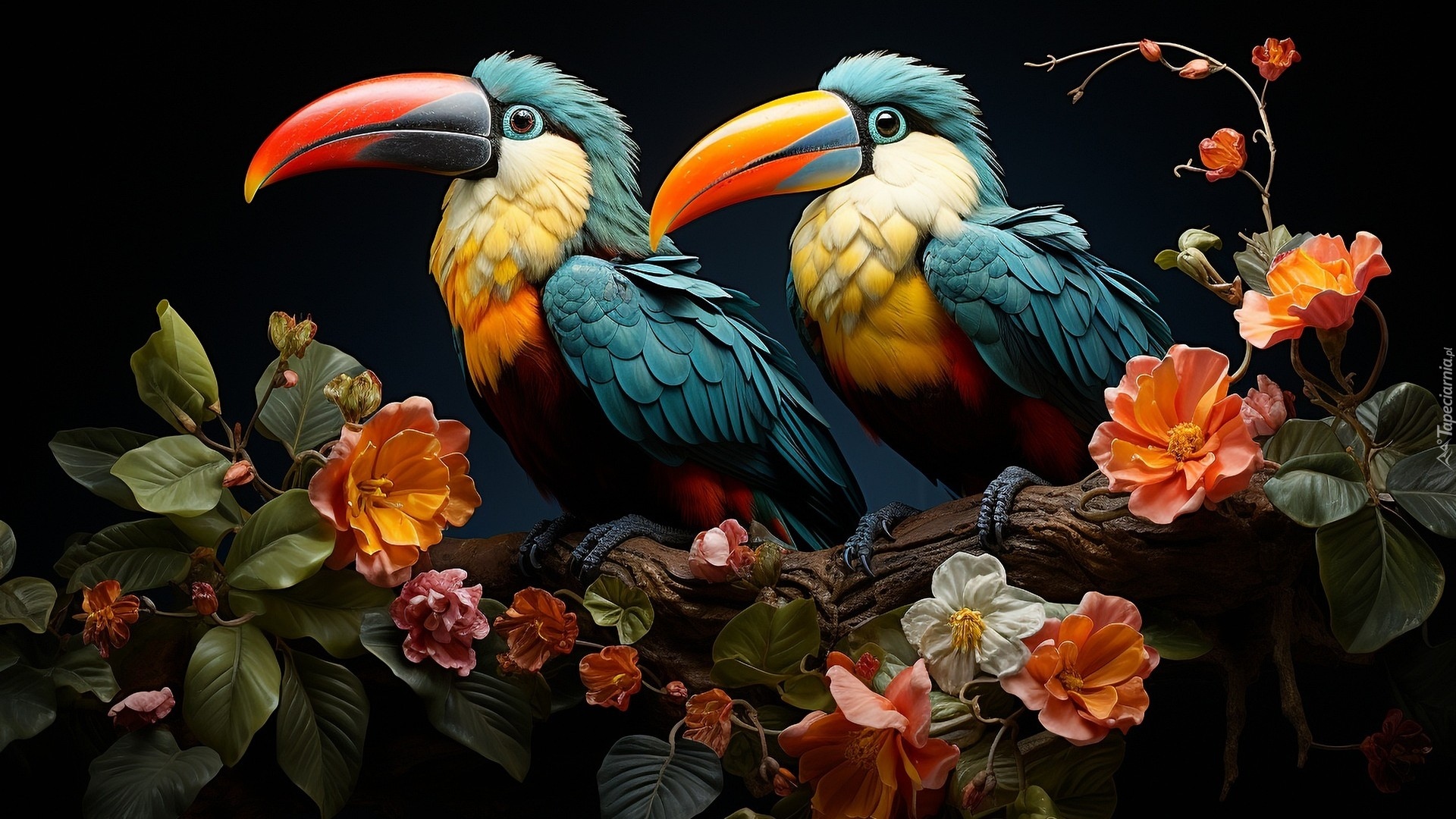 Edytor tapety: Dwa tukany na konarze z kolorowymi kwiatami