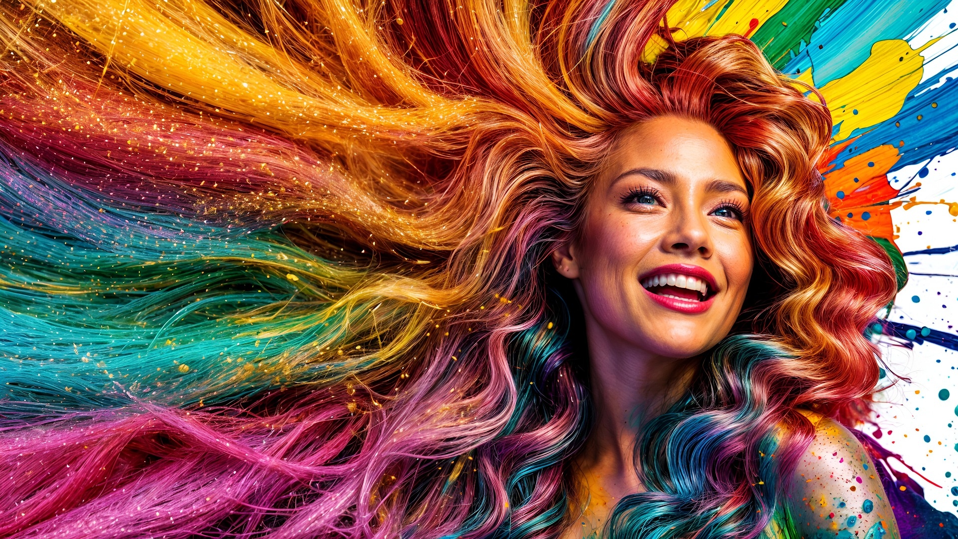 Edytor tapety: Uśmiechnięta kobieta z długimi kolorowymi włosami