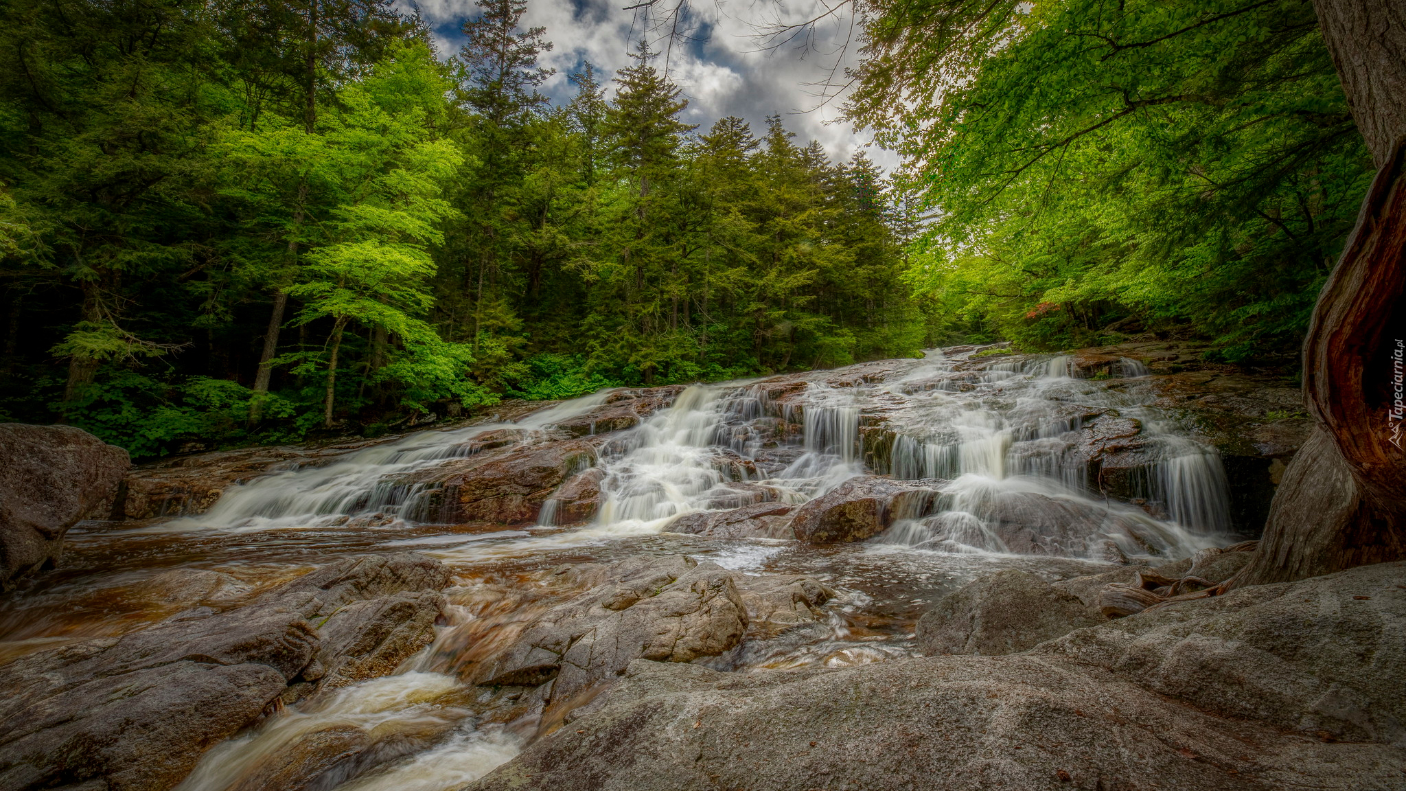 Edytor tapety: Drzewa po obu stronach rzeki spływającej po skałach