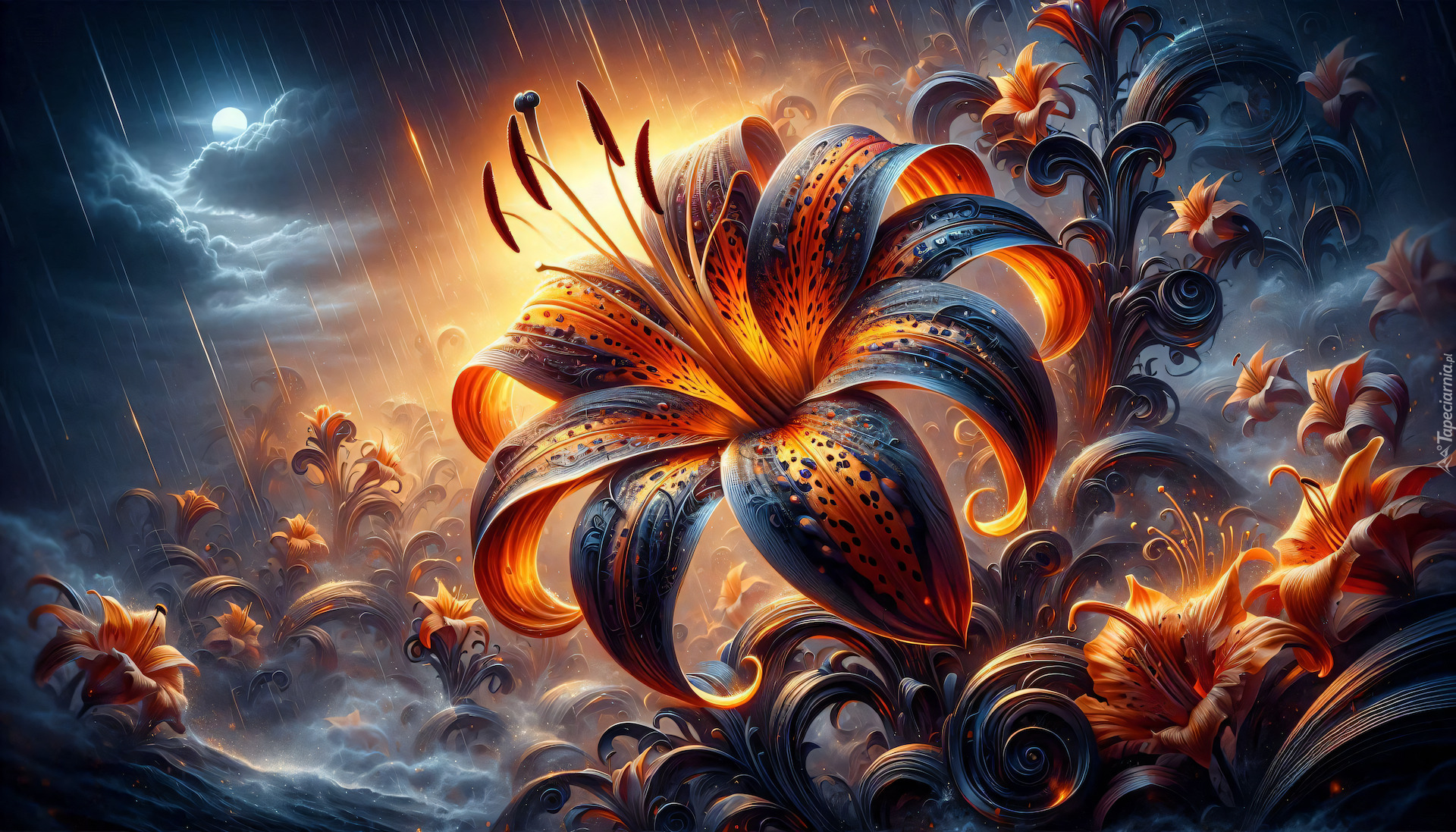 Edytor tapety: Rozkwitnięta i rozświetlona lilia w grafice