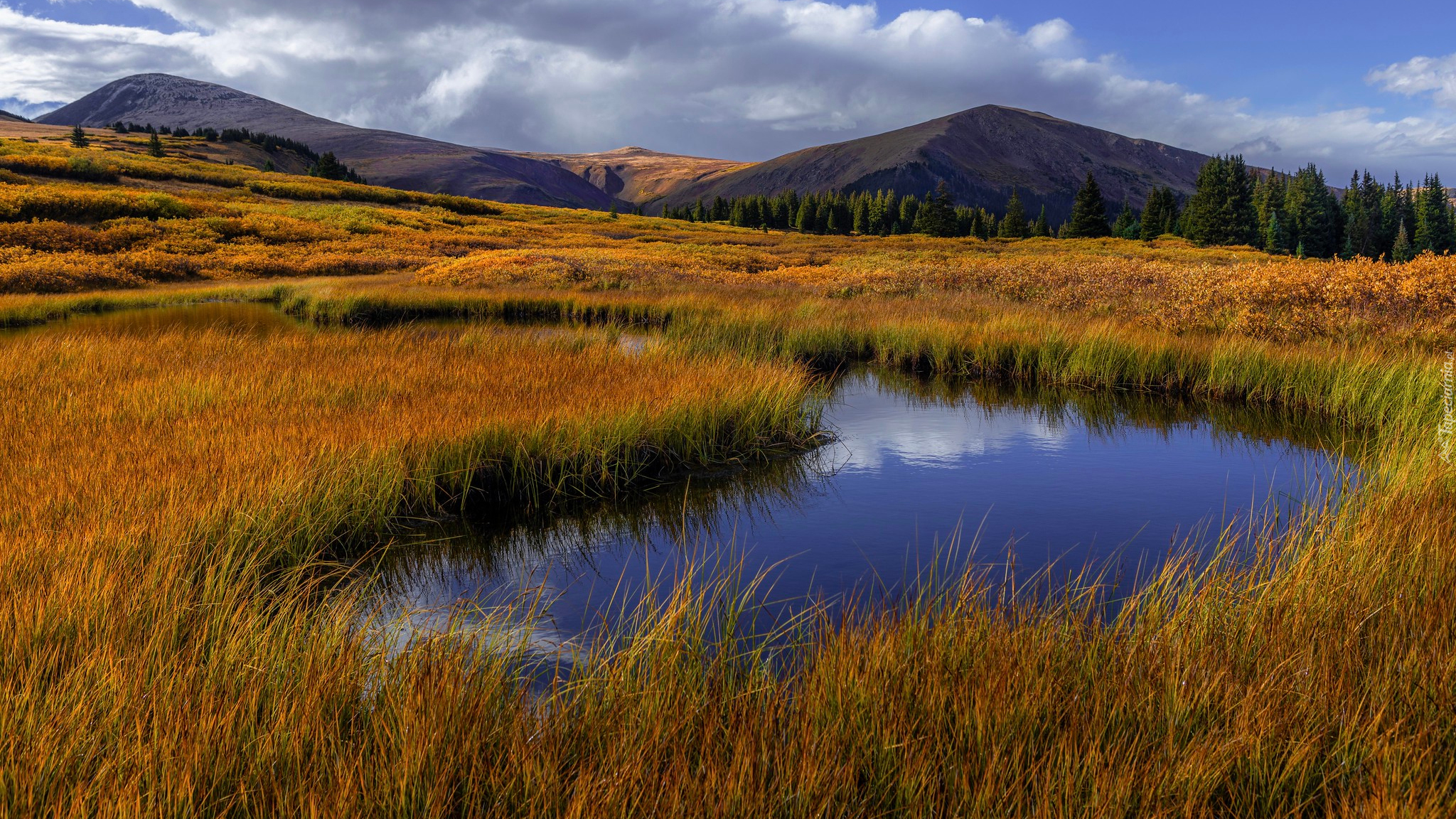 Edytor tapety: Pożółkła trawa nad stawem na tle gór