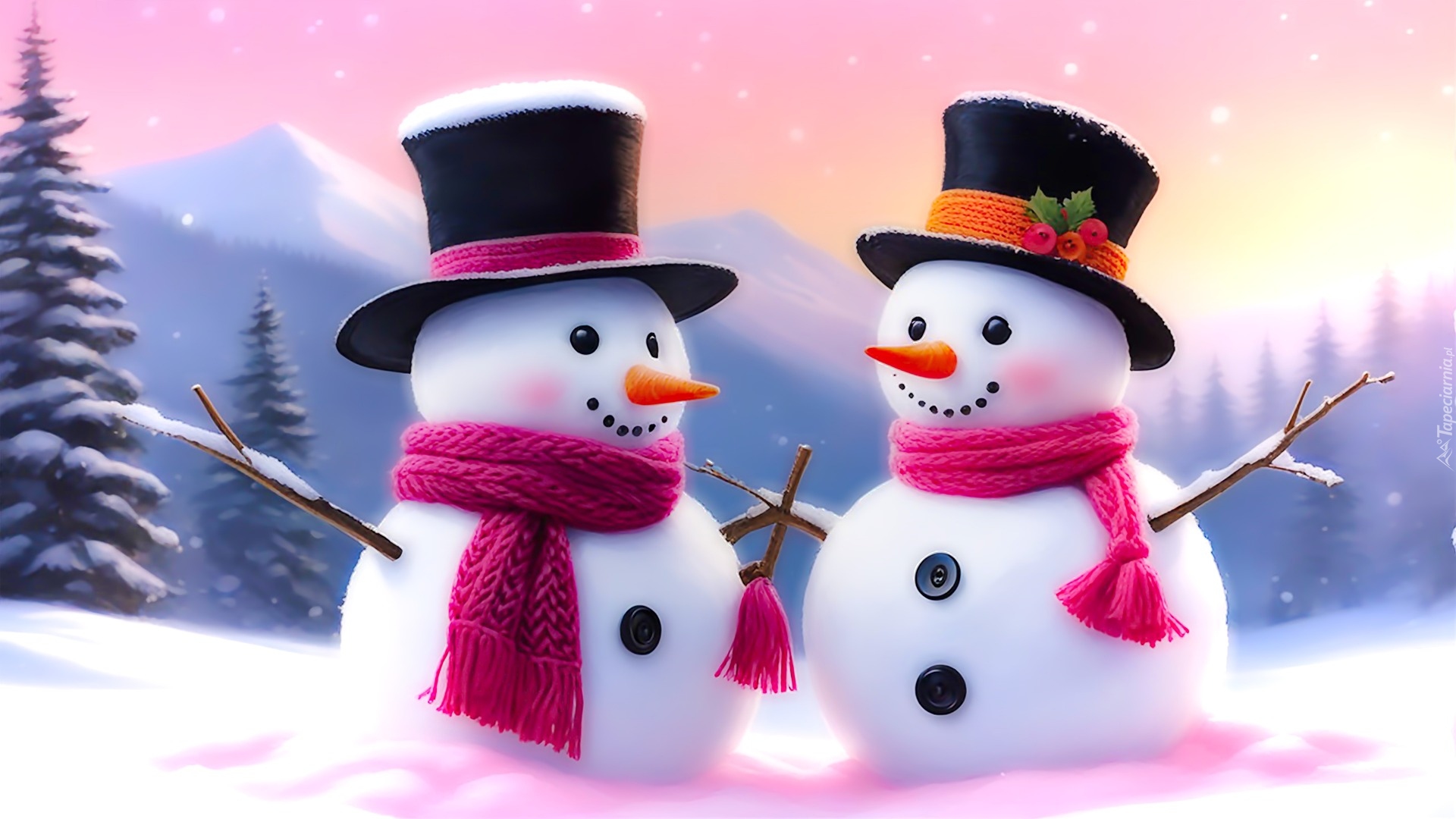 Edytor tapety: Dwa bałwany w kapeluszach i szalikach na śniegu