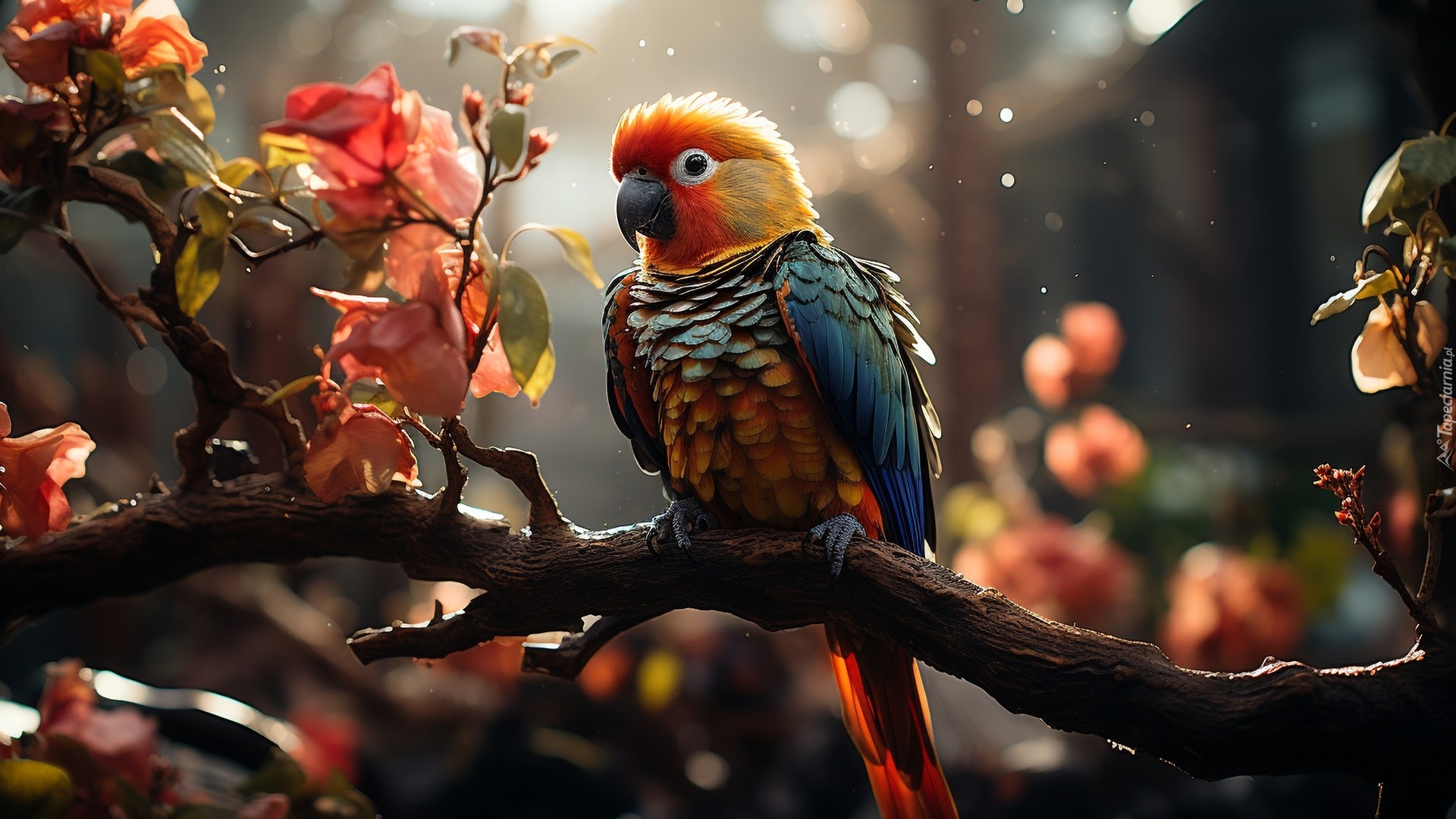 Edytor tapety: Papuga i kwiaty na gałęzi