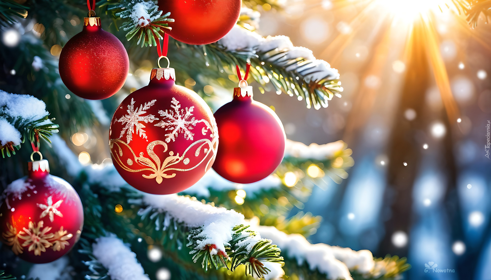 Edytor tapety: Czerwone bombki na ośnieżonych gałązkach choinki