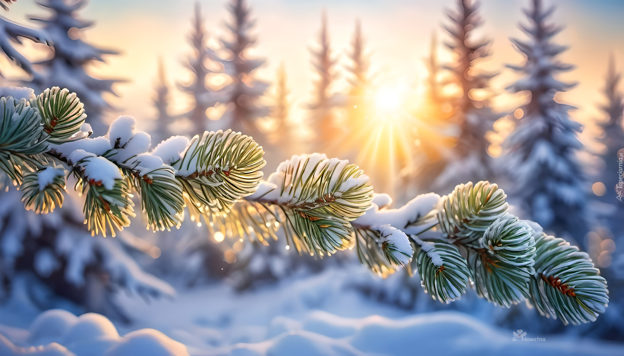 Edytor tapety: Rozświetlona promieniami słońca ośnieżona gałązka świerkowa