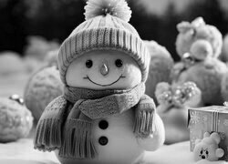 Edytor tapety: Bałwanek w czapce i szaliku obok prezentu i bombek na śniegu