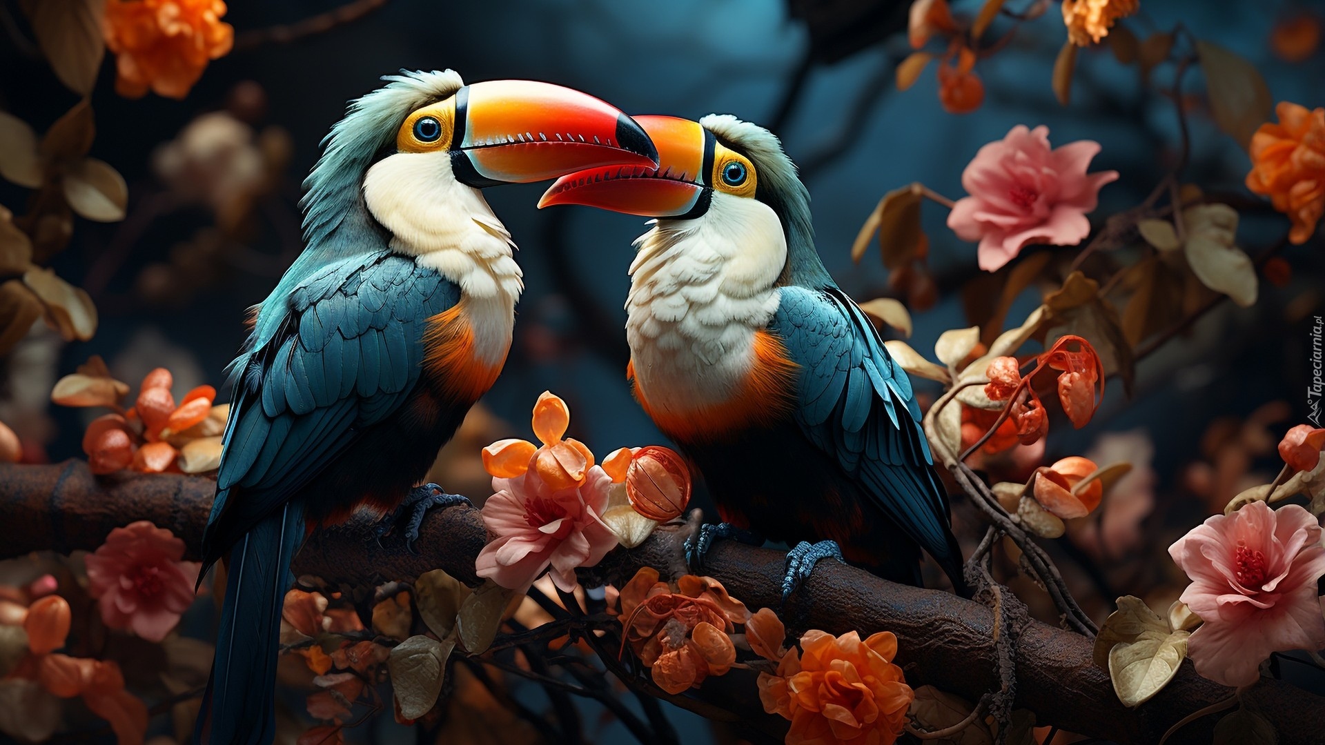 Edytor tapety: Dwa tukany i różowe kwiaty na konarze