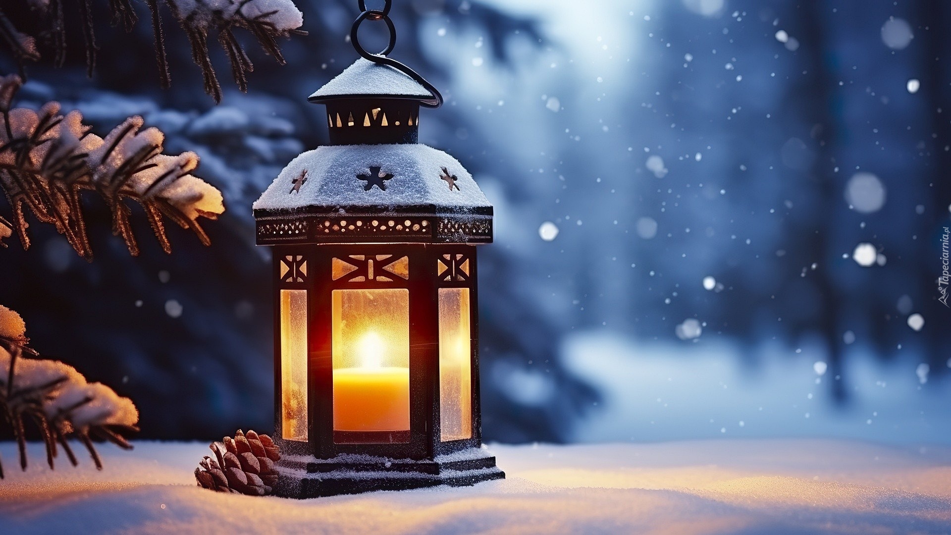 Edytor tapety: Lampion z zapaloną świecą obok ośnieżonych gałązek