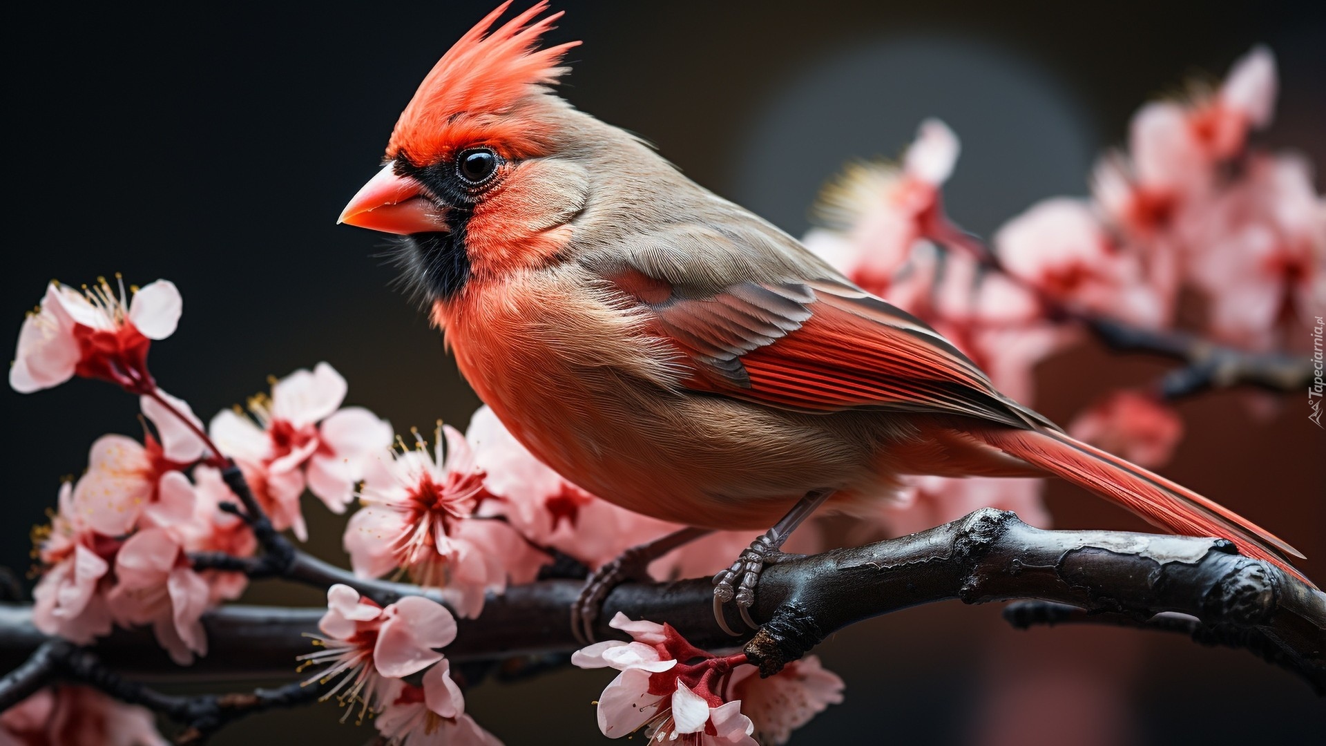 Edytor tapety: Kardynał na gałązce z różowymi kwiatami