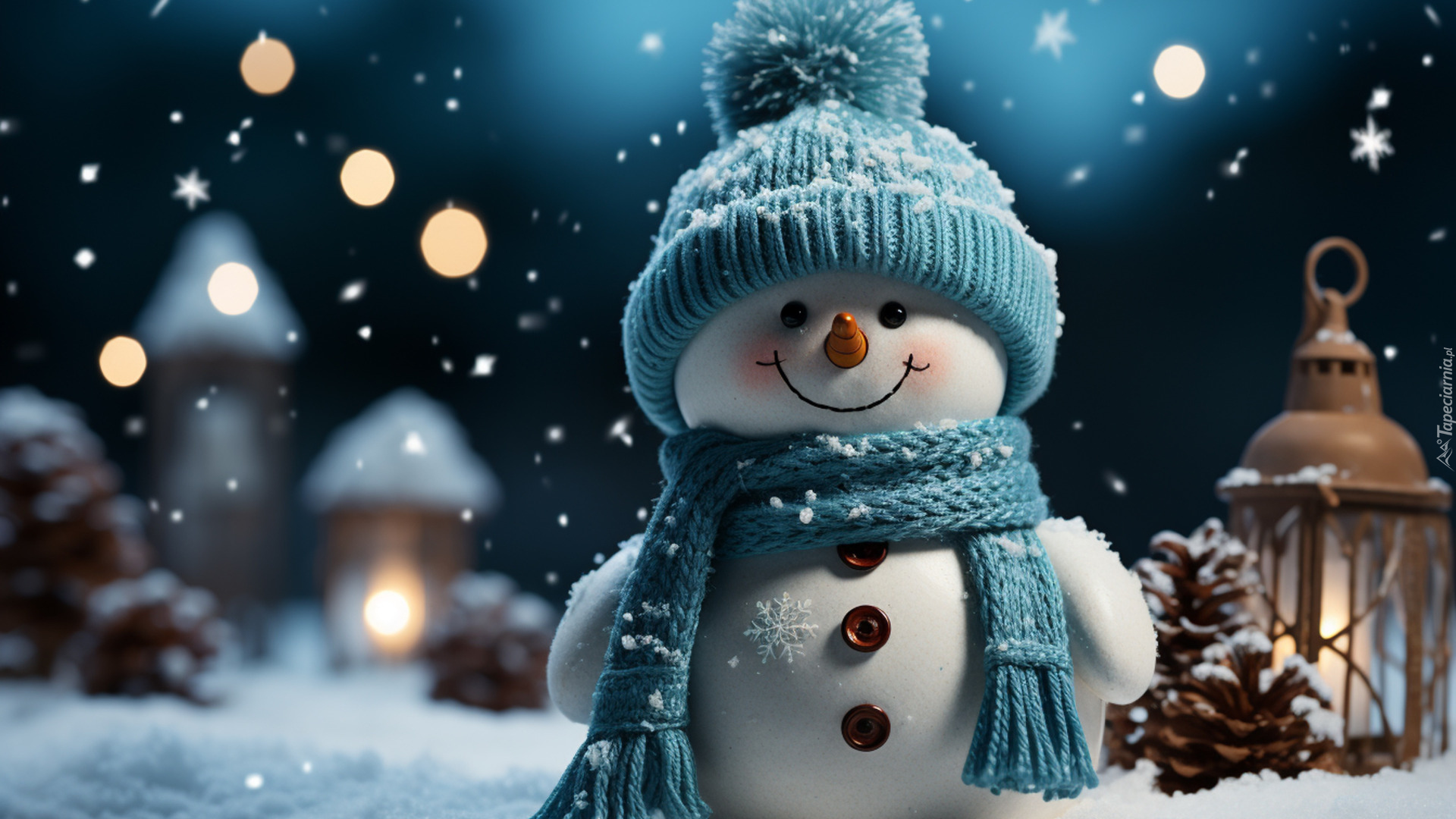 Edytor tapety: Uśmiechnięty bałwanek w niebieskim szaliku i czapce