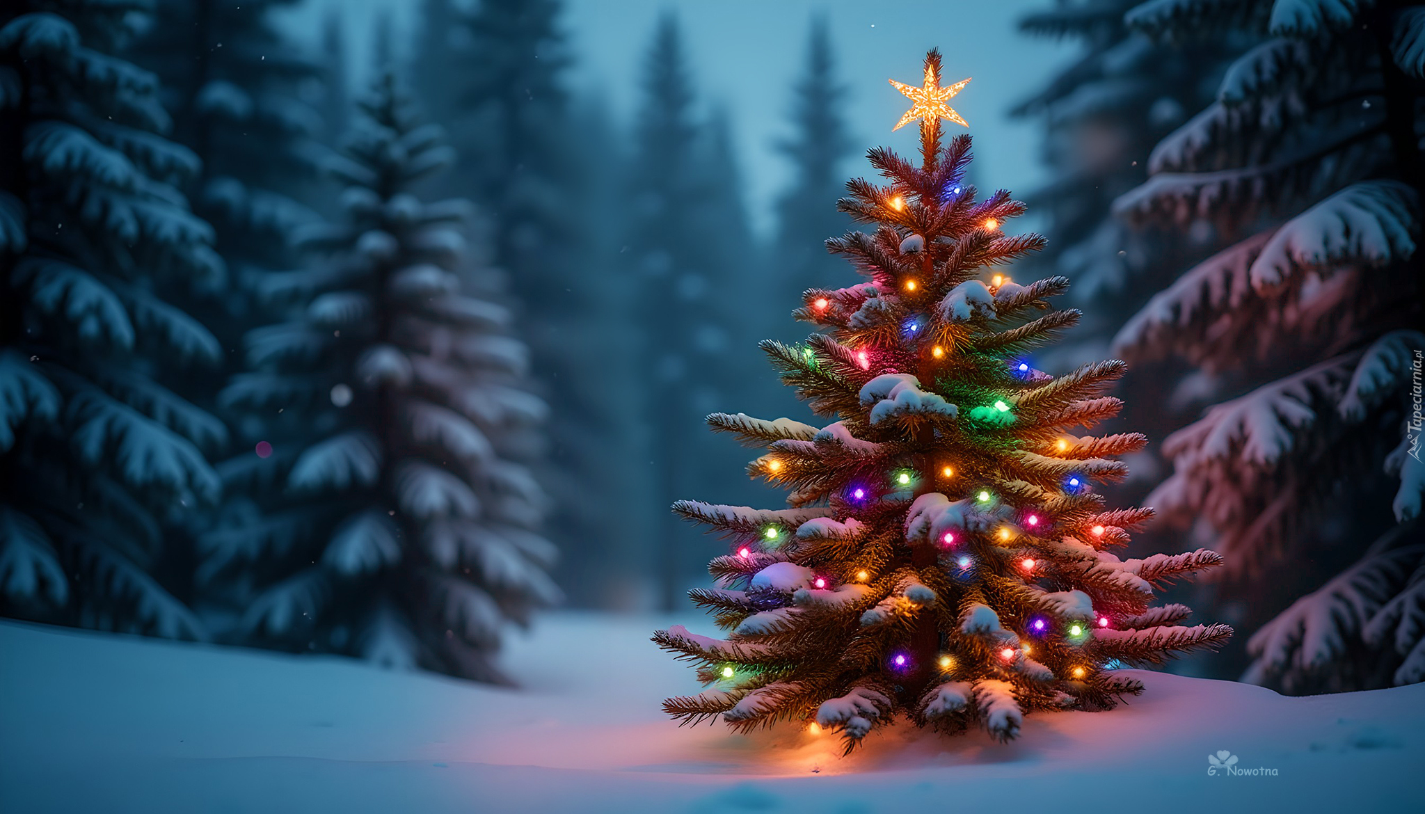 Edytor tapety: Zapalone lampki na choince w zimowym lesie