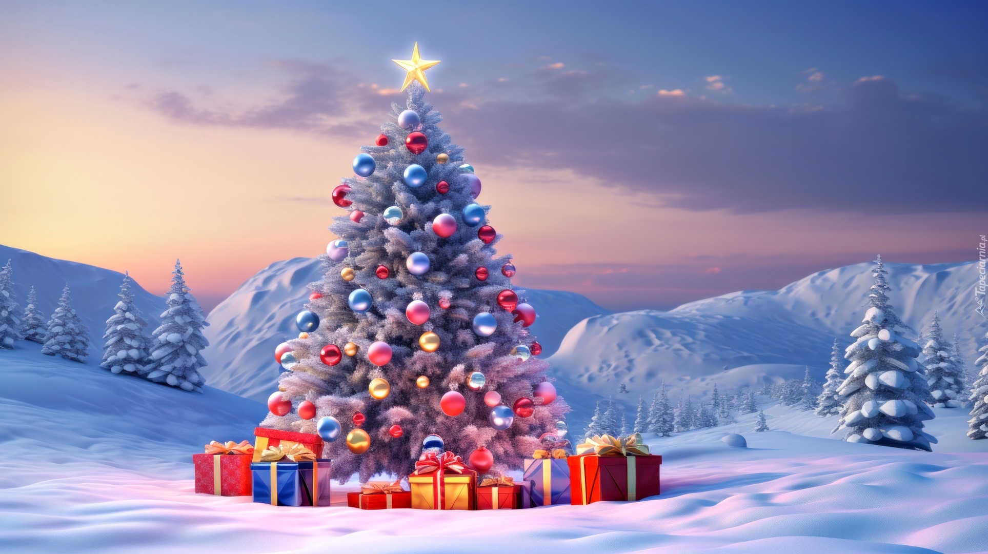 Edytor tapety: Kolorowe prezenty obok choinki na tle ośnieżonych gór