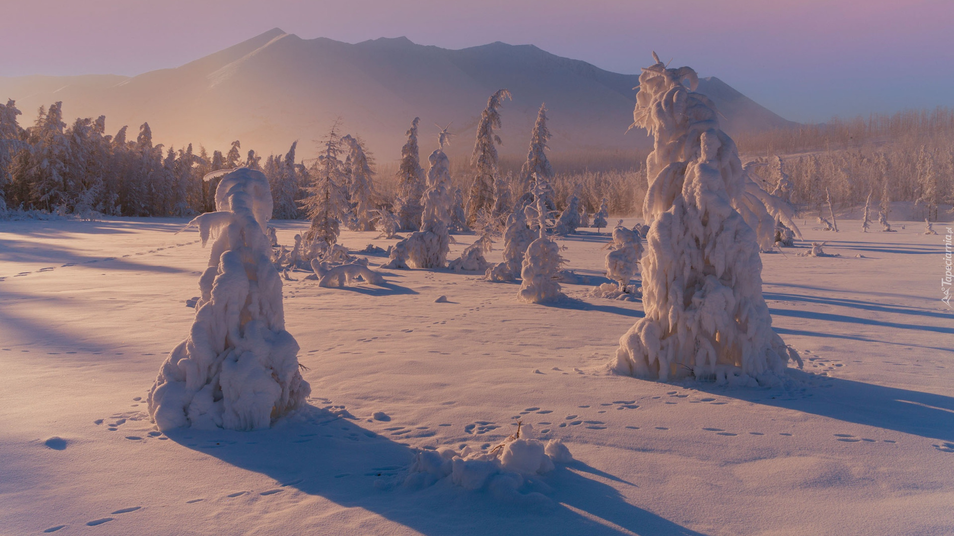 Edytor tapety: Zasypane śniegiem drzewa i poranna mgła nad górami