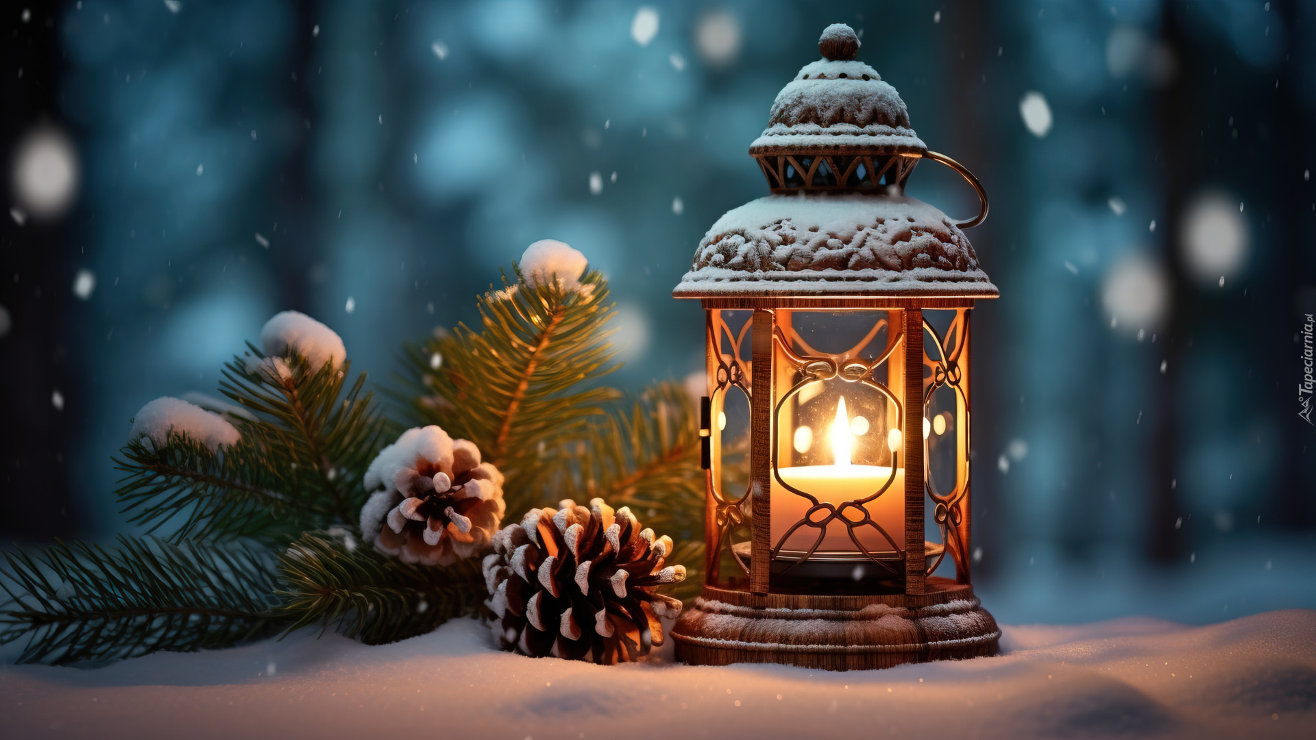Edytor tapety: Oprószony śniegiem zapalony lampion i szyszki na gałązkach