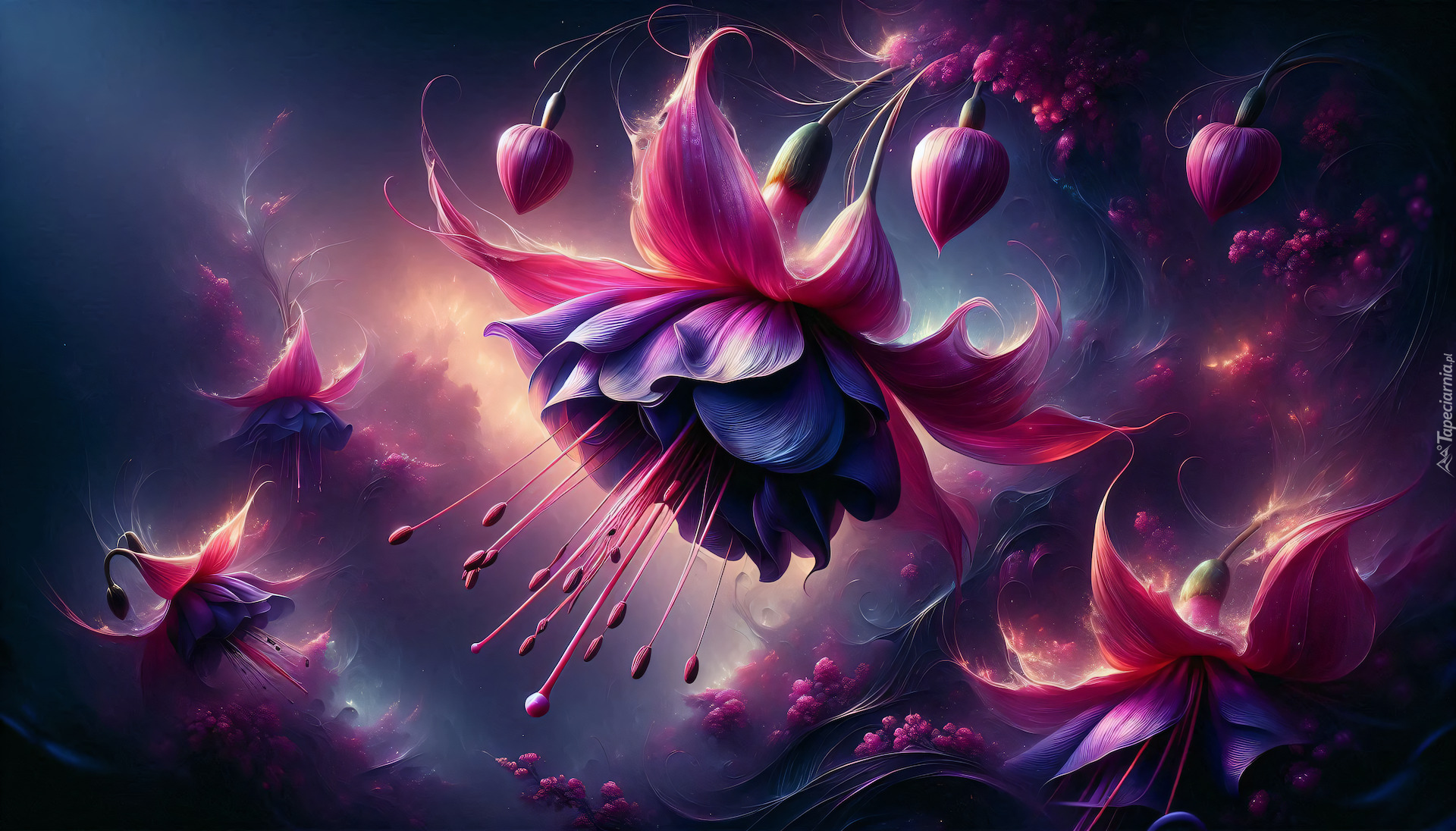 Edytor tapety: Rozświetlone i rozkwitnięte kwiaty fuksji