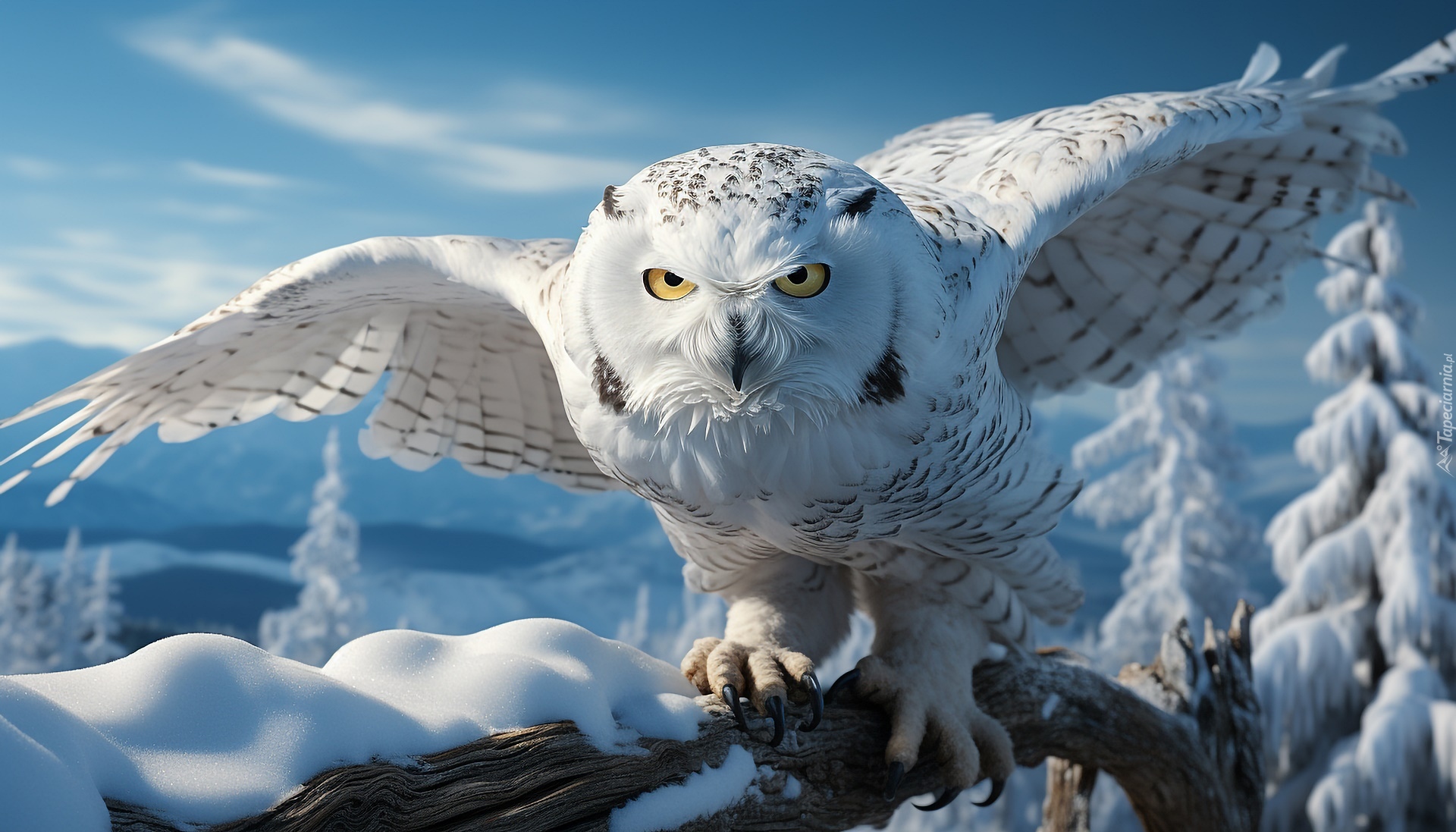 Edytor tapety: Sowa śnieżna z rozpostartymi skrzydłami na ośnieżonym konarze