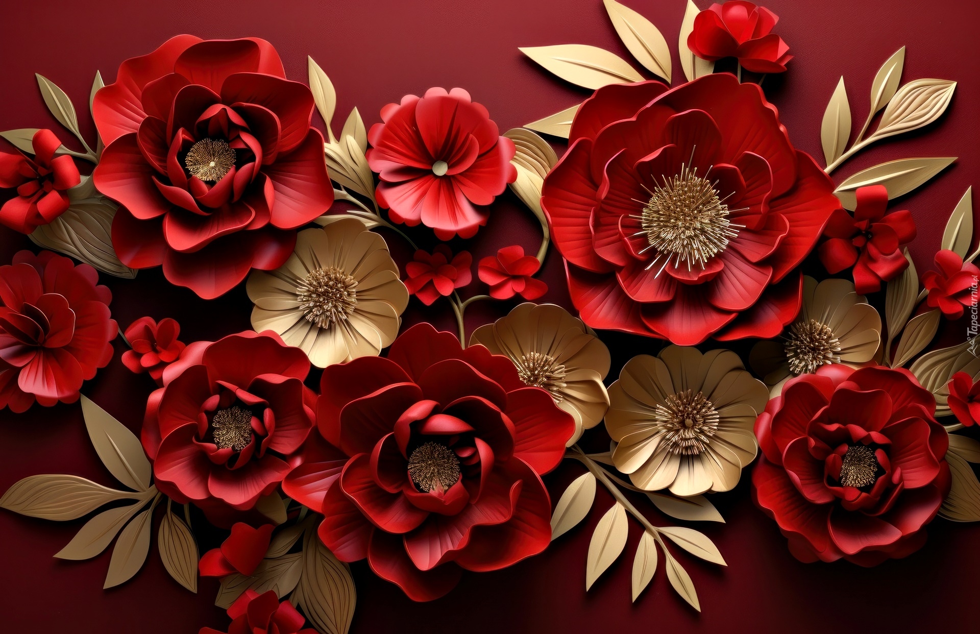 Edytor tapety: Czerwone i złote papierowe kwiaty na czerwonym tle