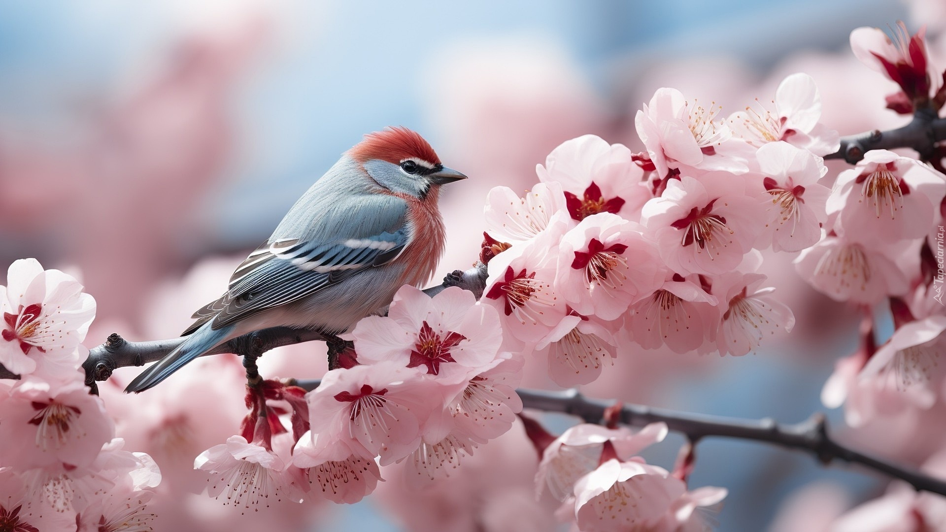 Edytor tapety: Ptak i różowe kwiaty na gałązce drzewa owocowego