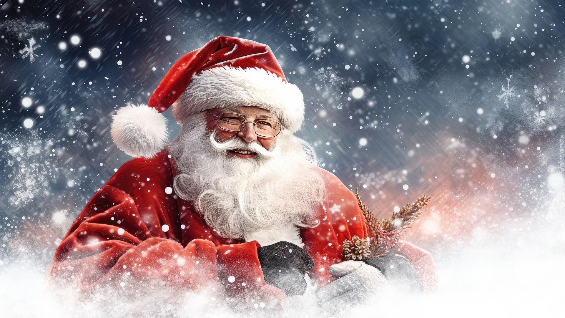 Edytor tapety: Uśmiechnięty Mikołaj w padającym śniegu