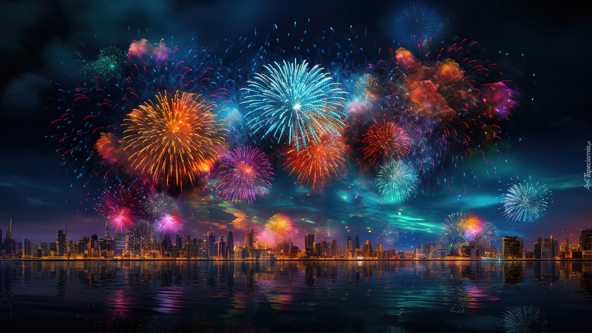 Edytor tapety: Fajerwerki w sylwestrową noc nad miastem i rzeką