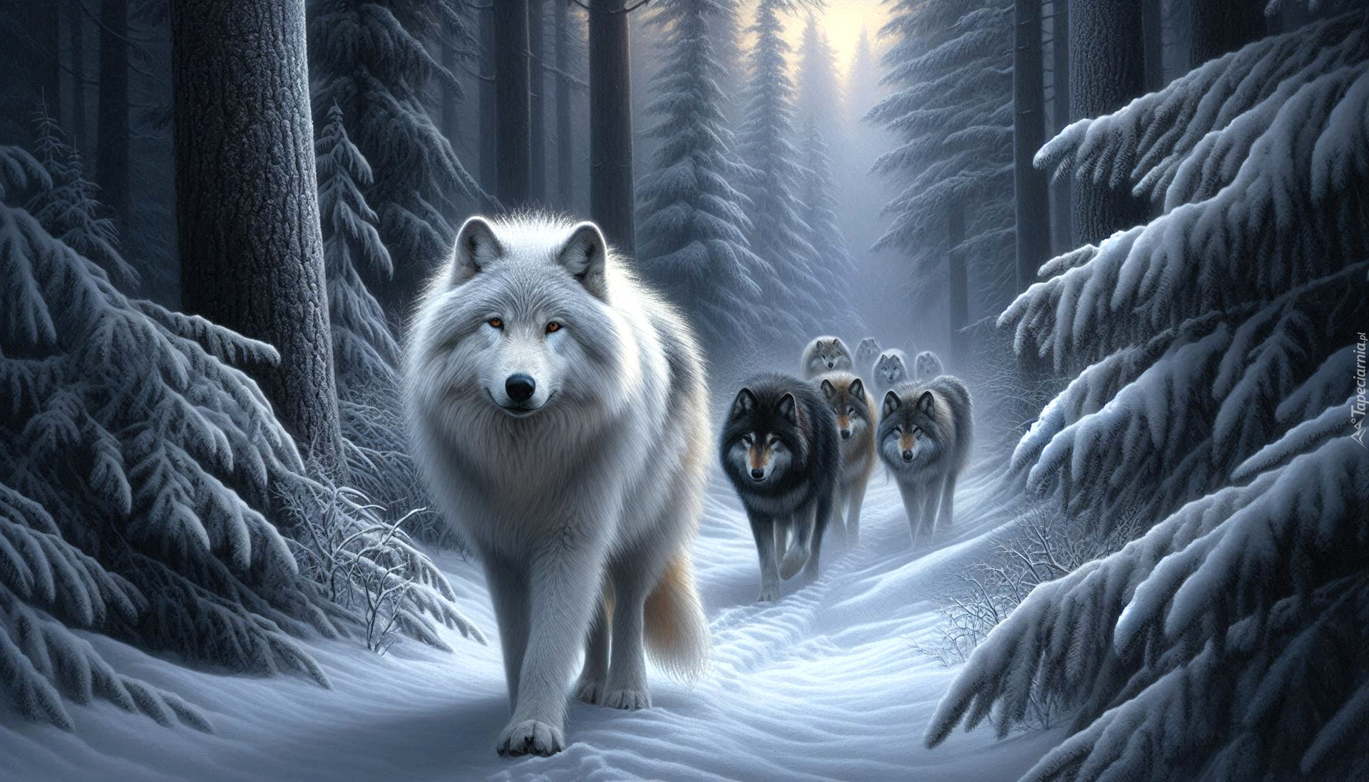 Edytor tapety: Wilki na ścieżce w zimowym lesie
