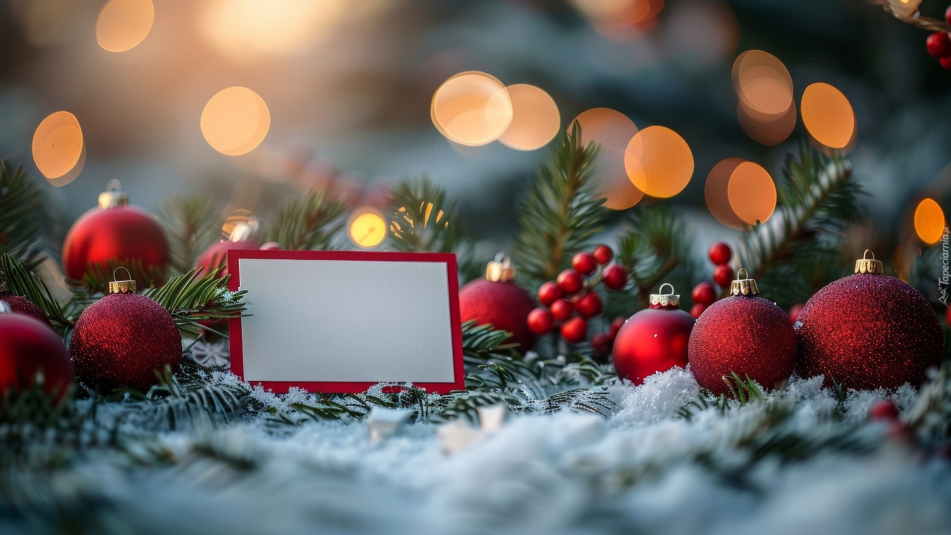 Edytor tapety: Ramka i czerwone bombki na ośnieżonych gałązkach