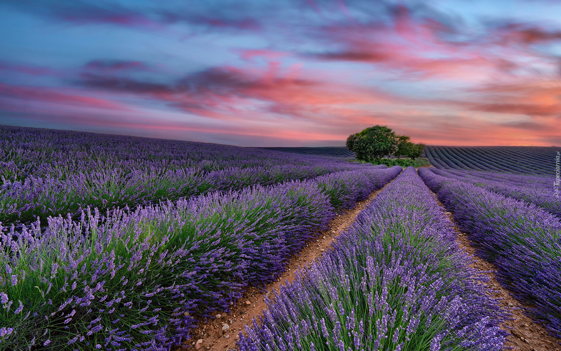 Edytor tapety: Drzewa i pole lawendy pod kolorowym niebem
