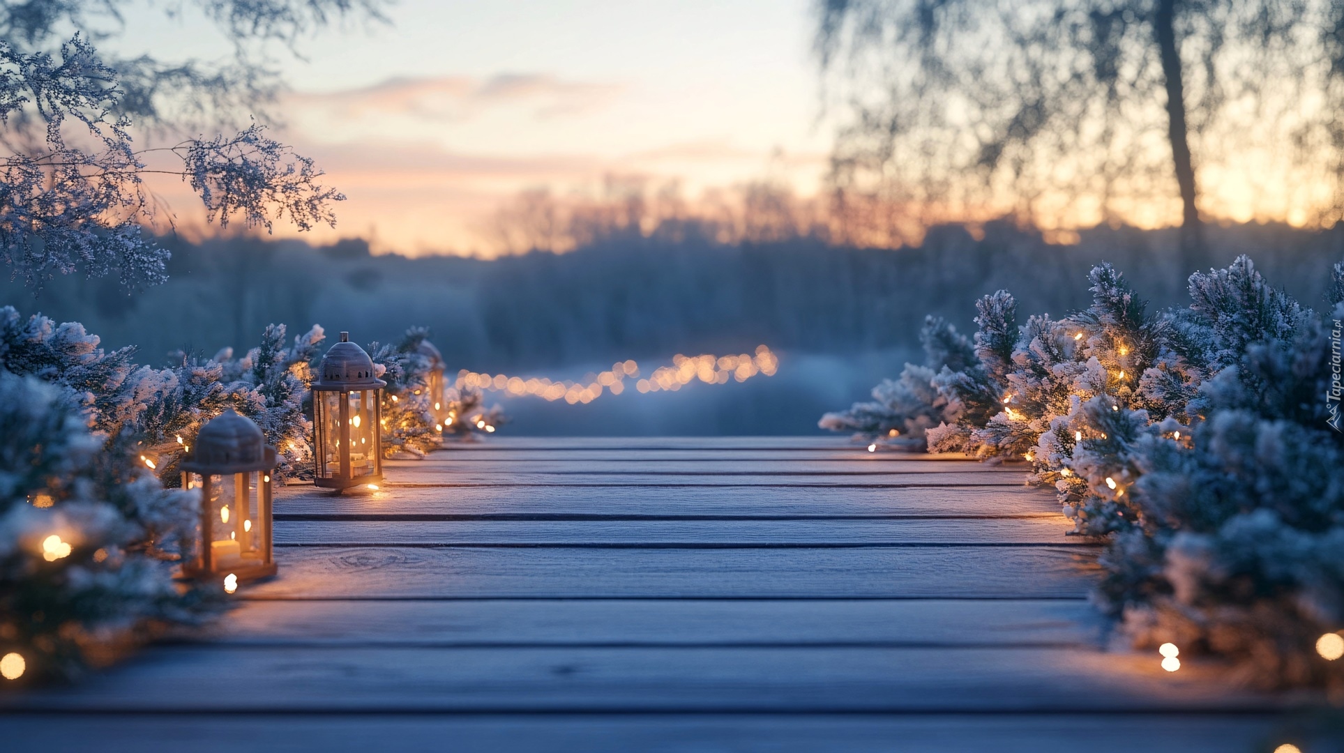 Edytor tapety: Zapalone lampiony i ośnieżone gałązki na pomoście