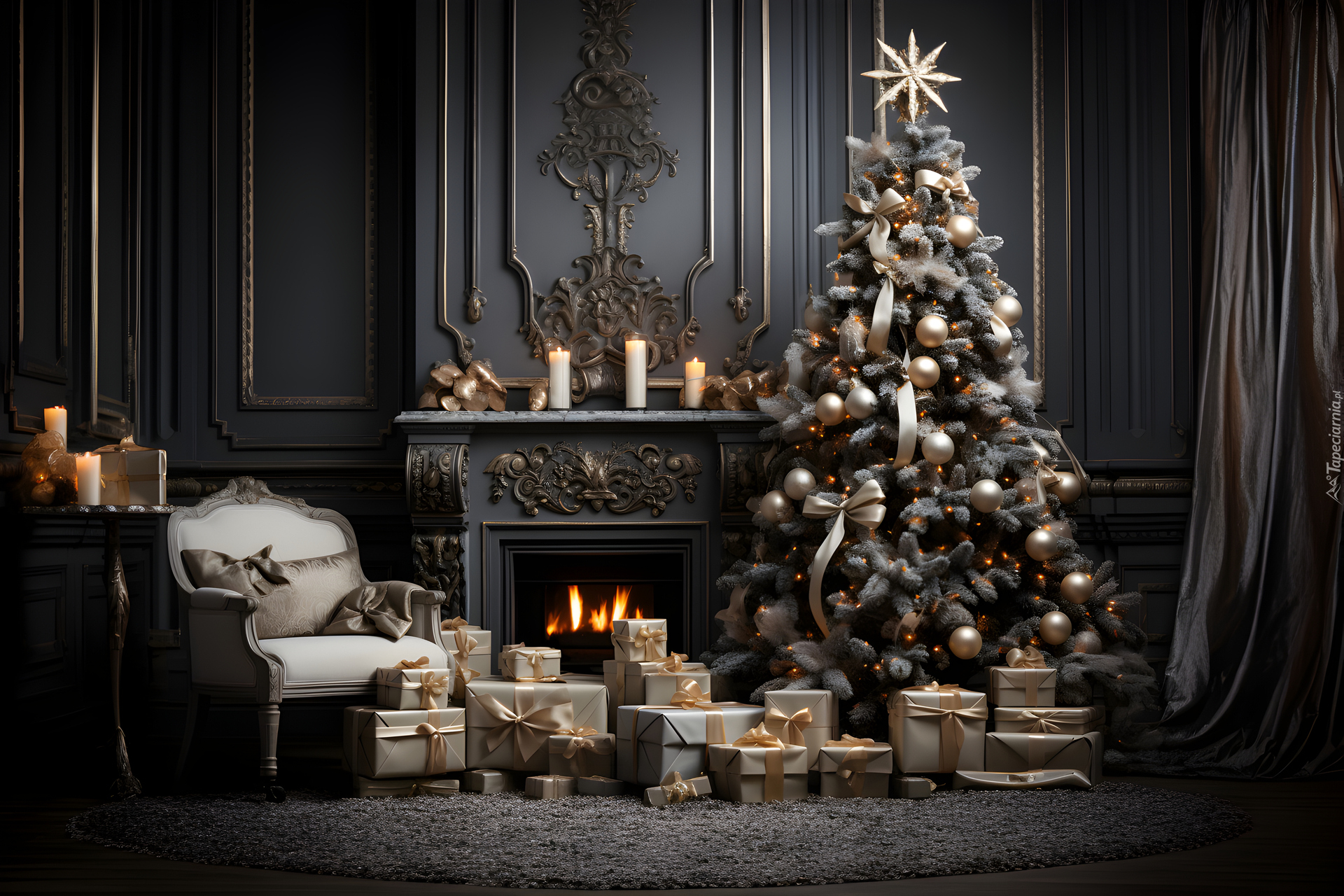 Edytor tapety: Prezenty i udekorowana choinka obok kominka