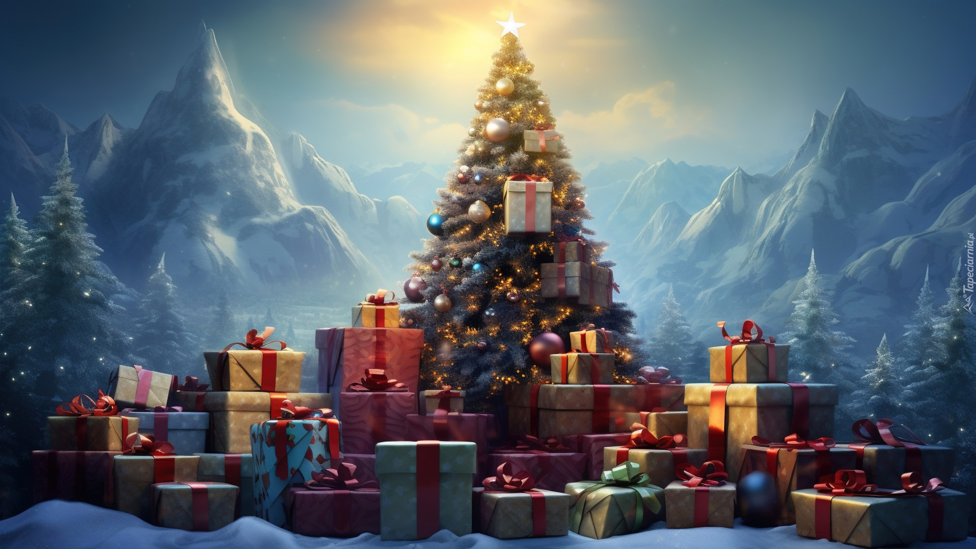 Edytor tapety: Prezenty pod udekorowaną choinką na tle gór