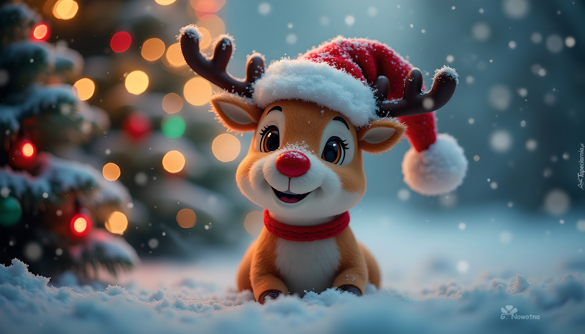 Edytor tapety: Renifer czerwononosy w czapce Mikołaja
