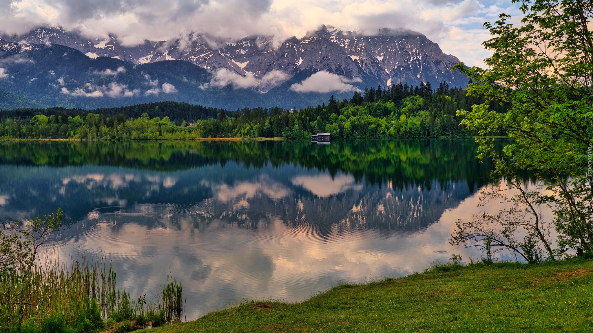 Edytor tapety: Odbicie w jeziorze Barmsee drzew i Alp Bawarskich