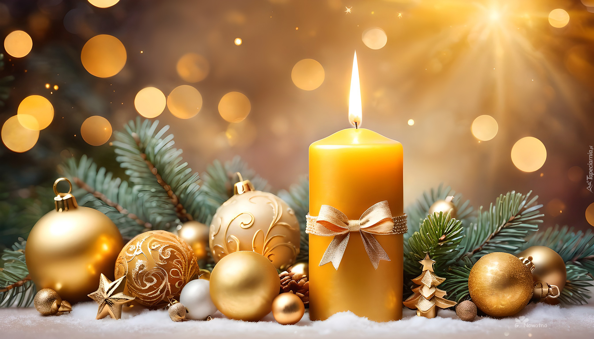 Edytor tapety: Zapalona żółta świeca obok bombek i gałązek świerkowych