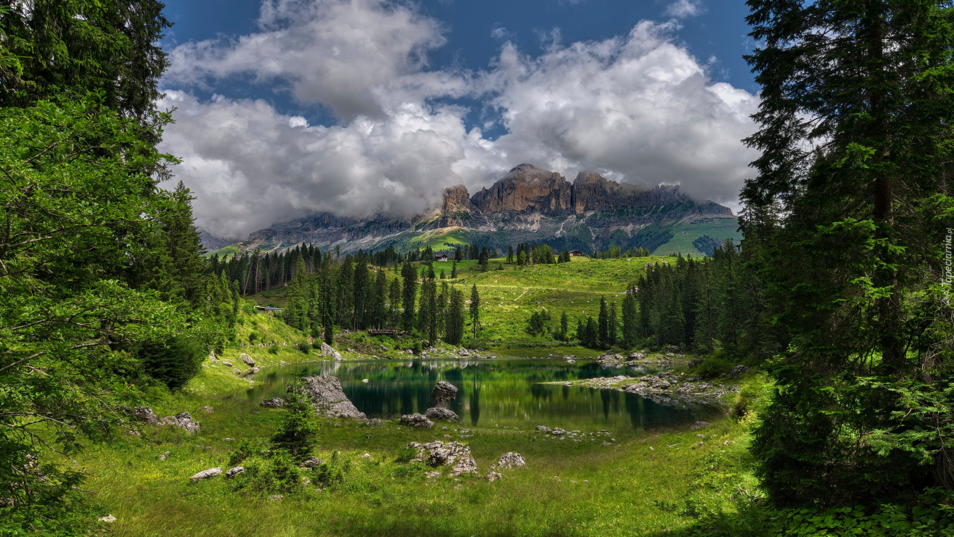 Edytor tapety: Drzewa nad jeziorem i chmury nad górami