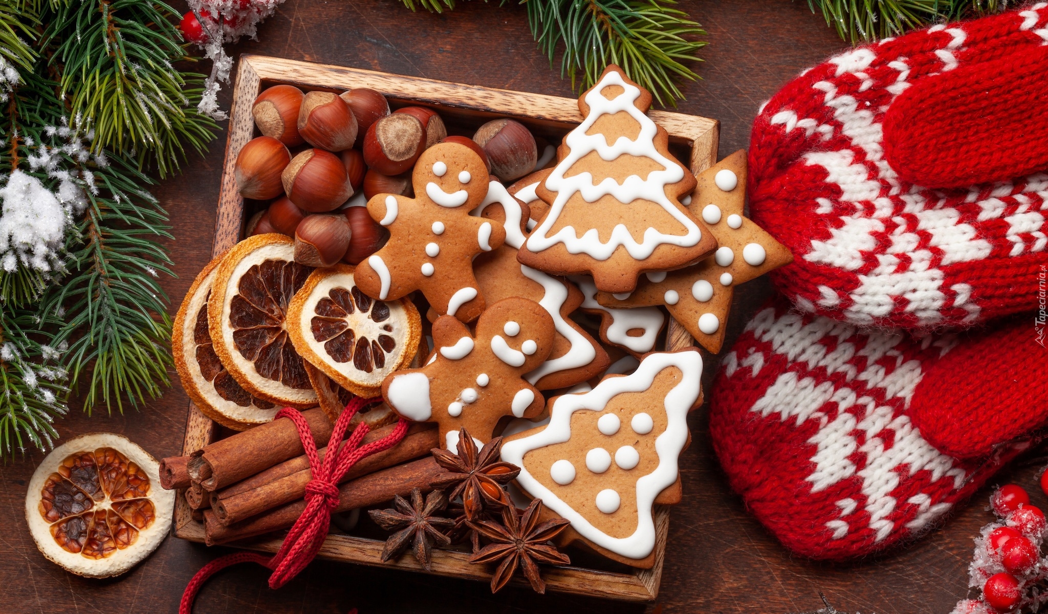 Edytor tapety: Pierniczki i orzechy w pudełku obok czerwonych rękawiczek