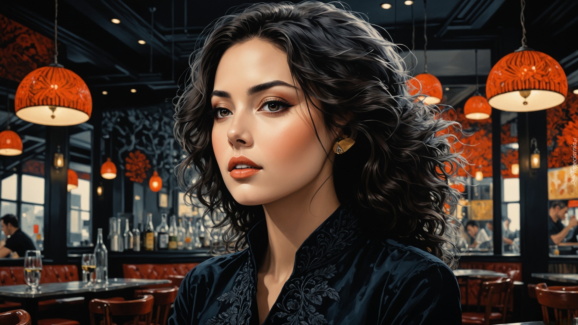 Edytor tapety: Twarz brunetki z kręconymi włosami