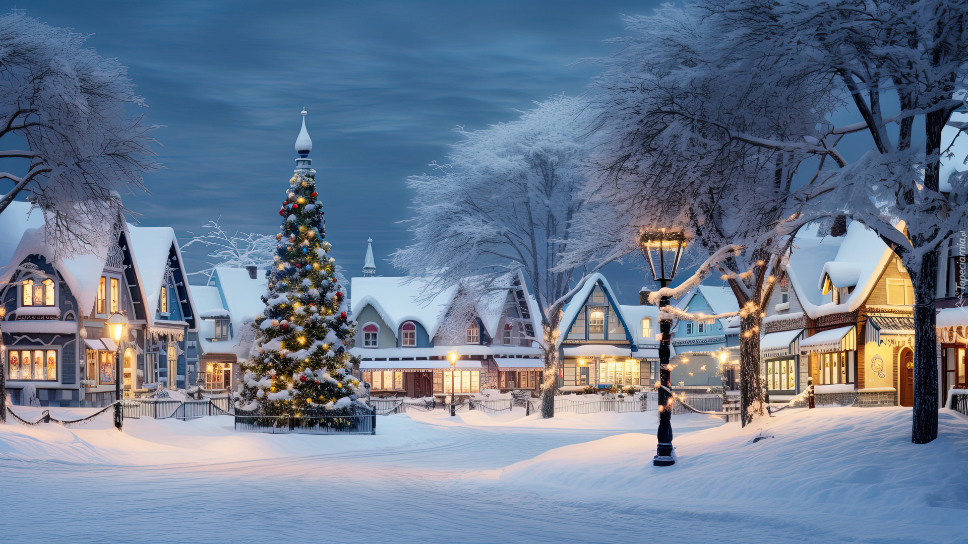 Edytor tapety: Udekorowana choinka na placu otoczona rozświetlonymi domami