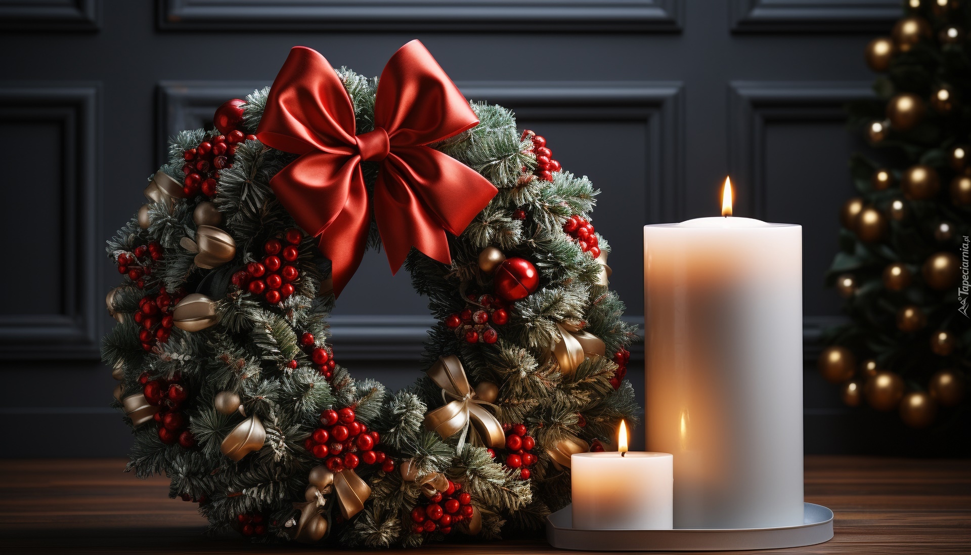 Edytor tapety: Dwie świece obok wieńca świątecznego z czerwoną kokardą