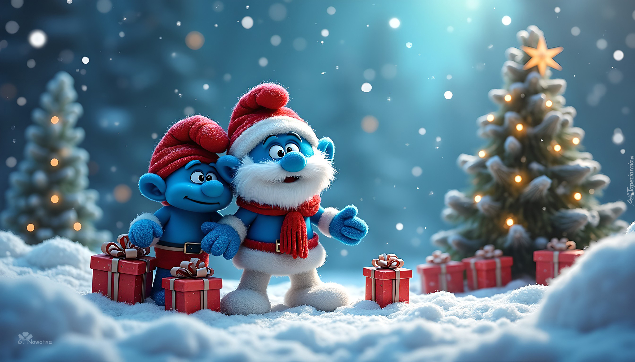 Edytor tapety: Smerfy z prezentami i oświetlona choinka na śniegu